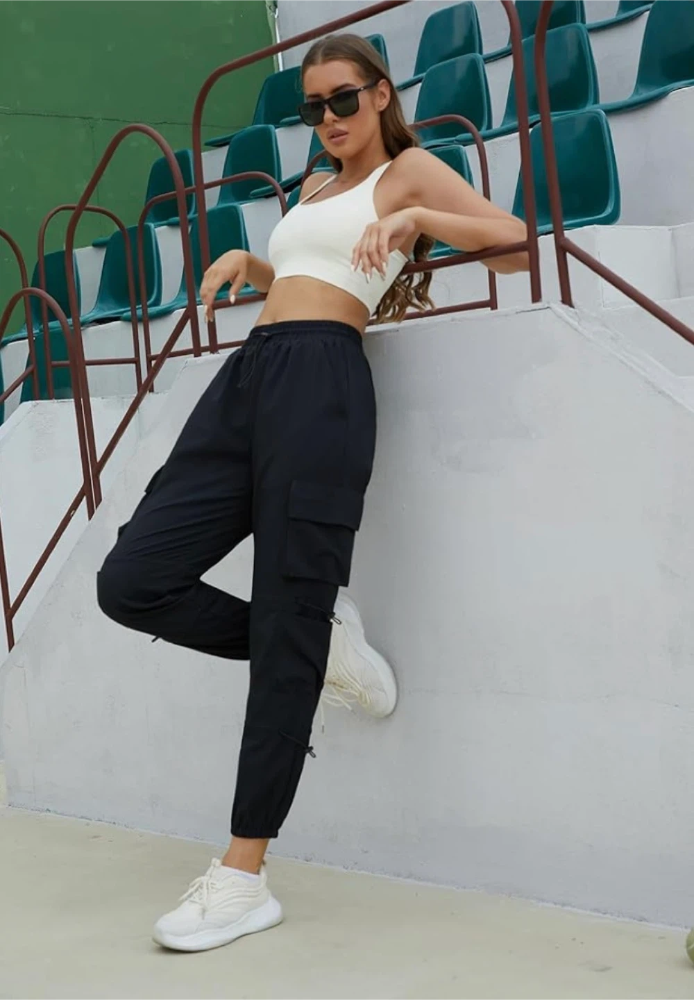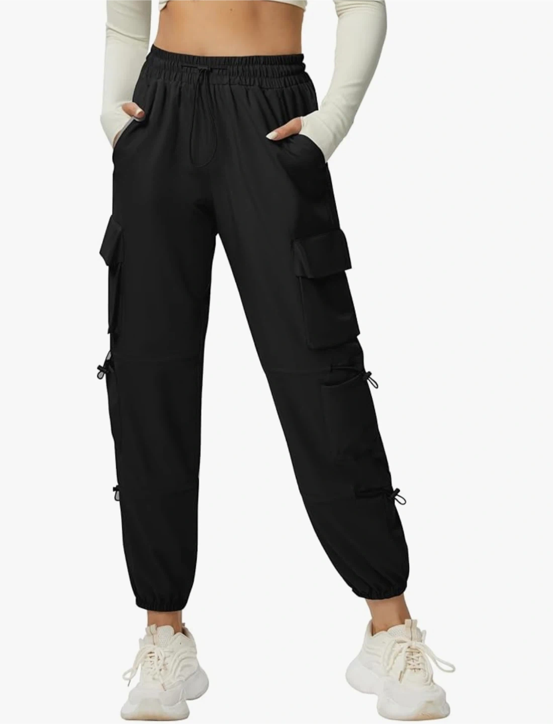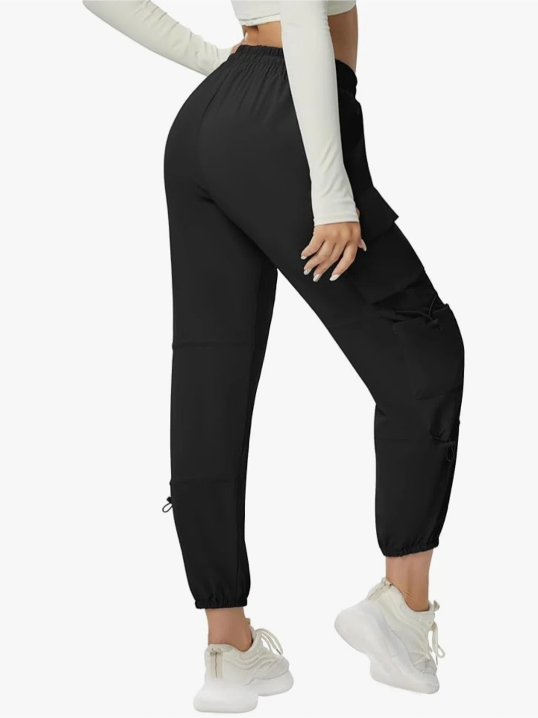 These black cargo pants are super comfy and stylish! They feature an elastic waistband with a drawstring cord for a perfect fit. Plus, they have six large pockets for all your essentials. The tapered legs with elastic cuffs are great for moving around easily!