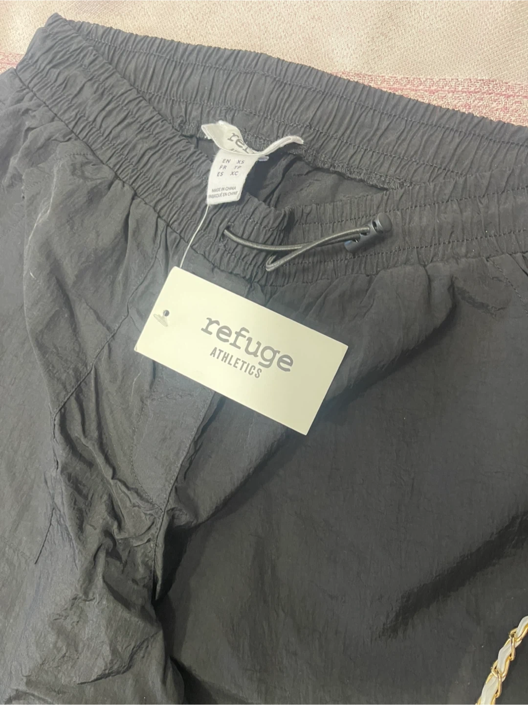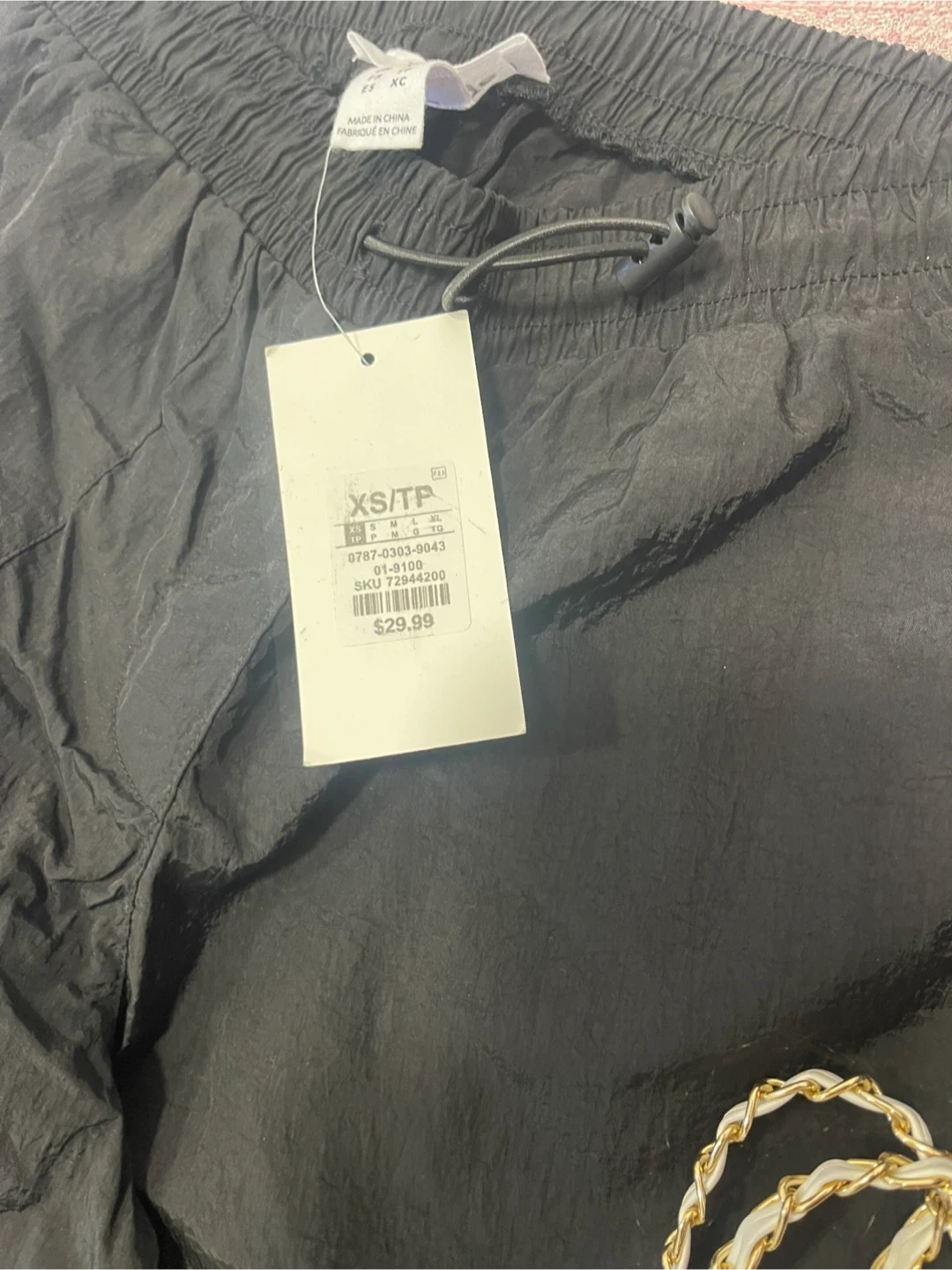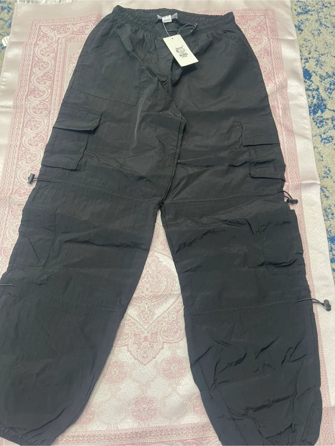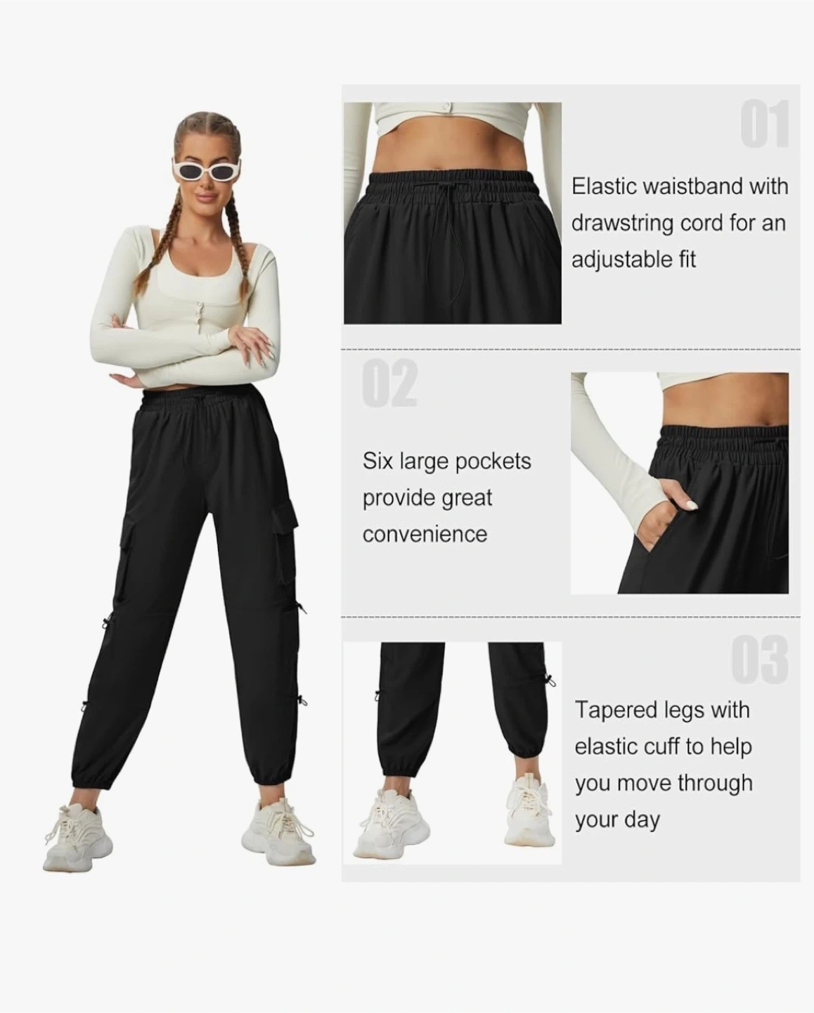 These black cargo pants are super comfy and stylish! They feature an elastic waistband with a drawstring cord for a perfect fit. Plus, they have six large pockets for all your essentials. The tapered legs with elastic cuffs are great for moving around easily!