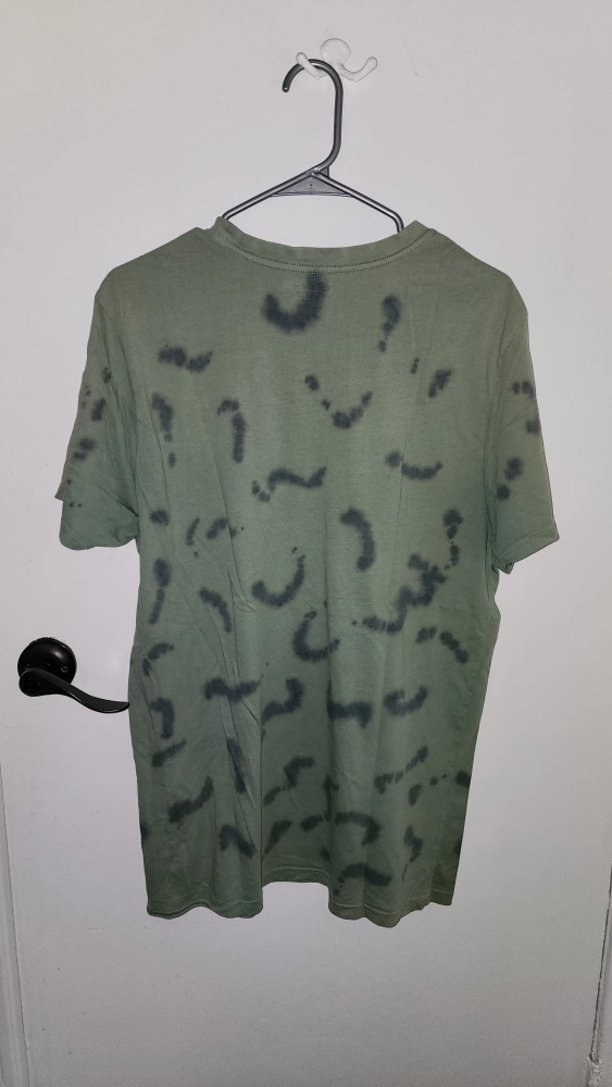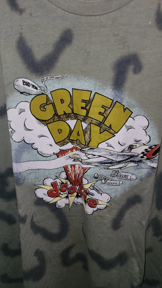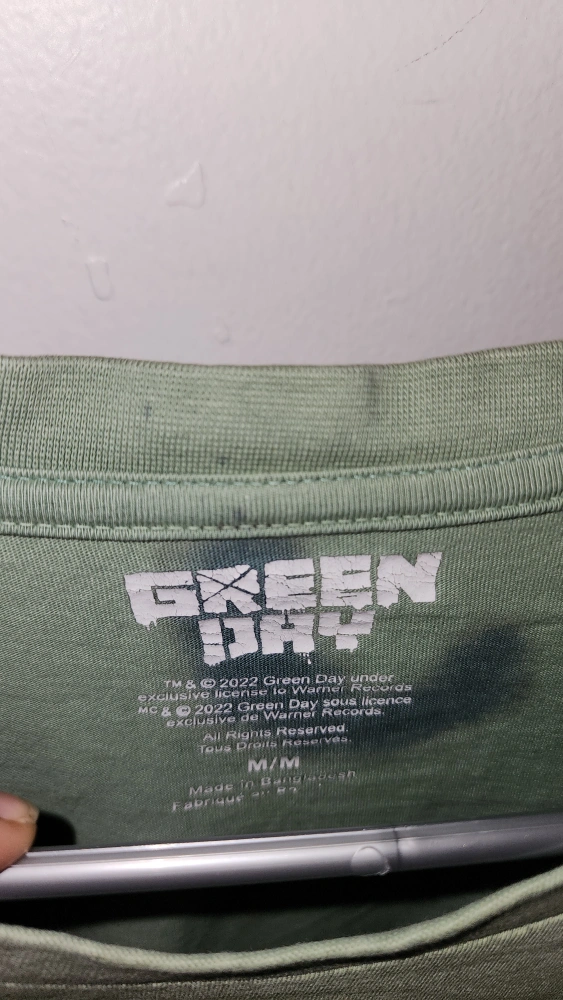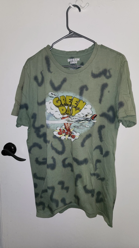 Selling a Green Day graphic t-shirt in size M/M. It's a cool design for any fan of the band! The shirt is green with a graphic print on the front.