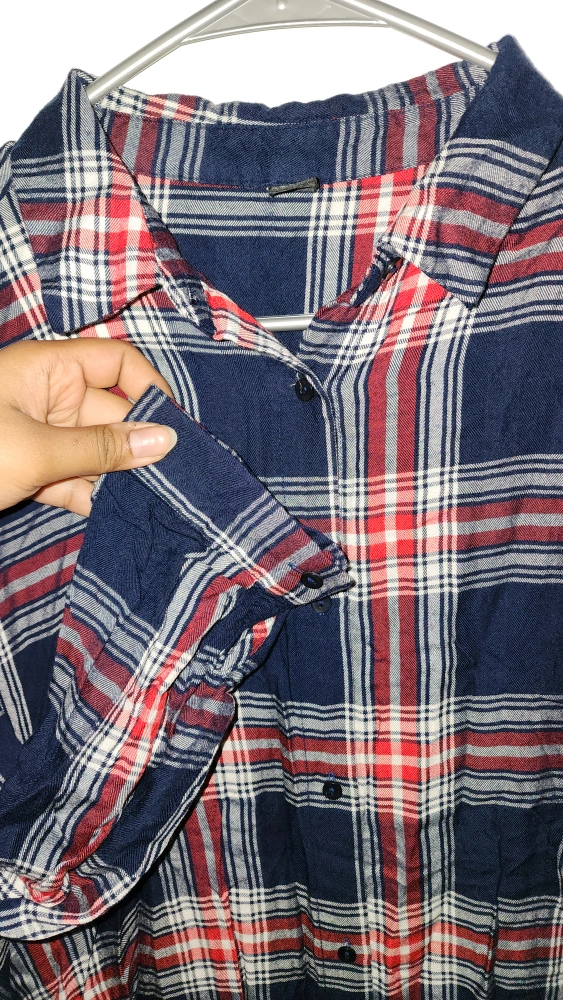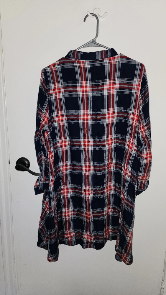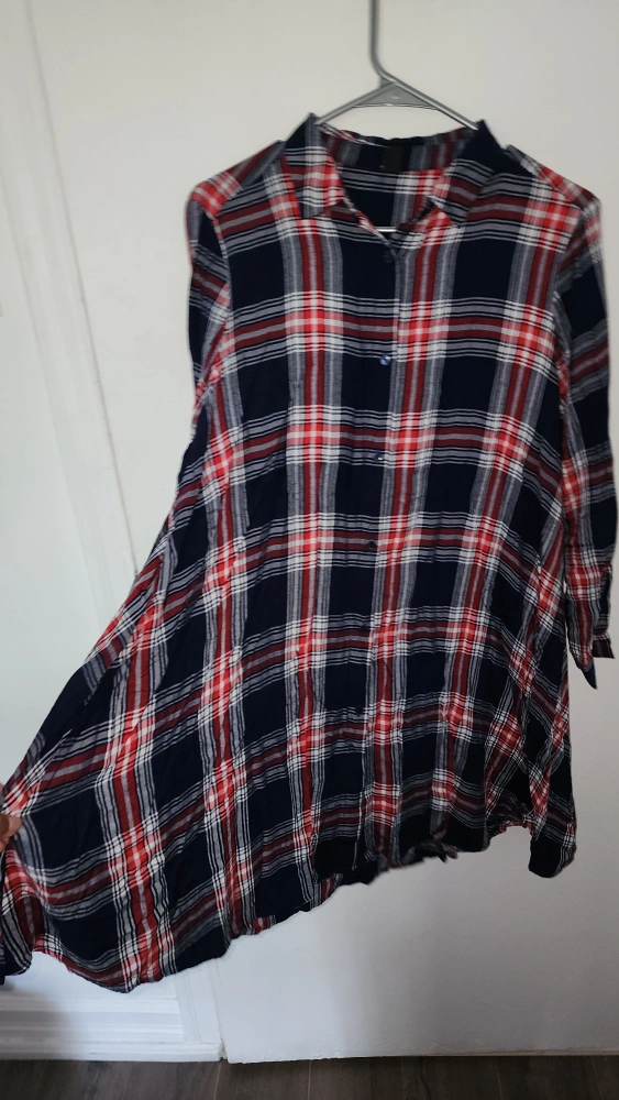 I'm selling a super cute flannel shirt dress! It features a classic plaid pattern with red, white, and navy blue. The size is UK 14 / US 10.