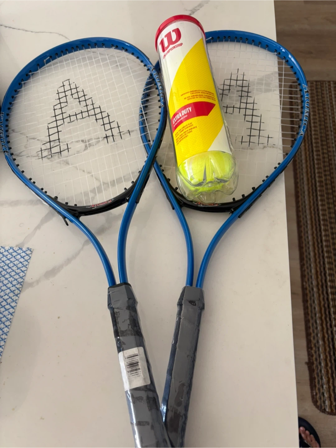 Selling two tennis racquets and a can of Wilson Extra Duty tennis balls.
