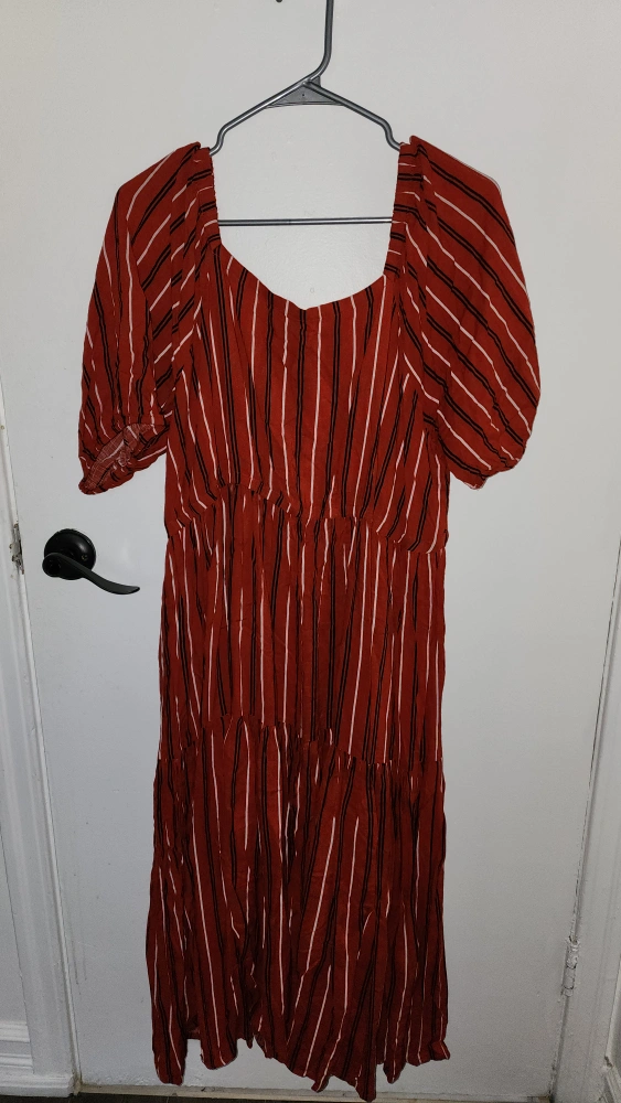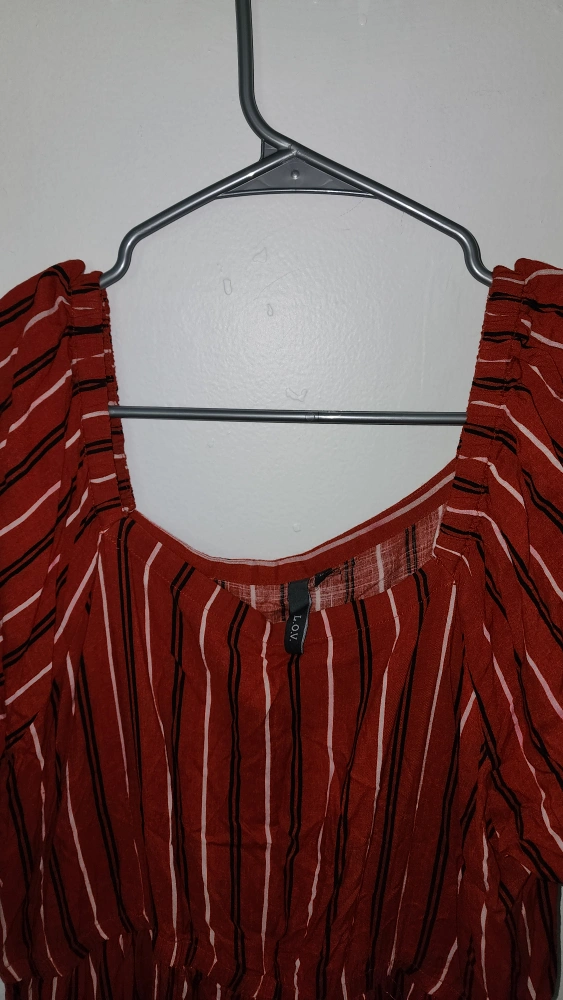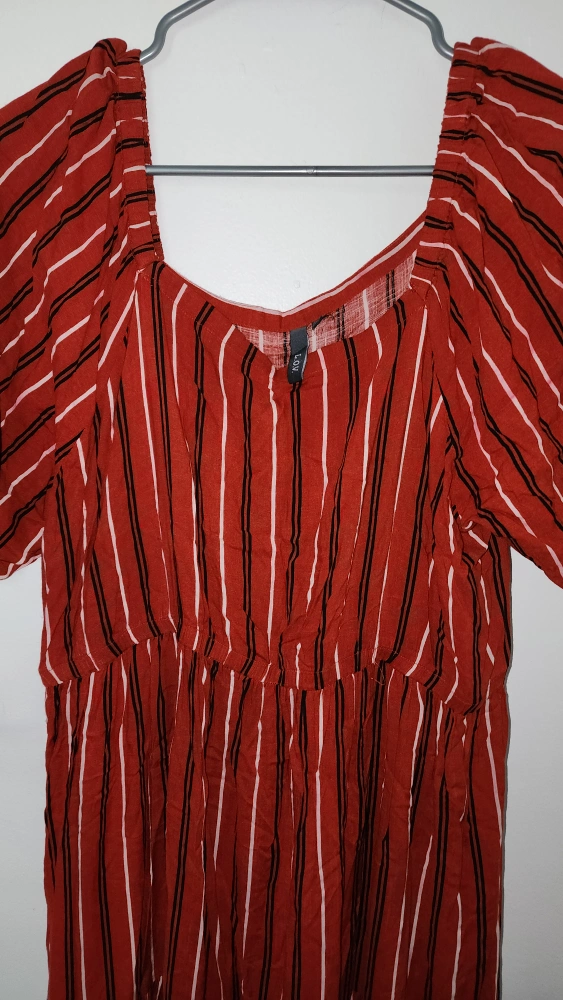Here's a cute dress from L.O.V. in size XL! The dress features a red colour with white and black stripes. It has a square neckline and short, puffed sleeves. Perfect for a casual outing or a summer day!