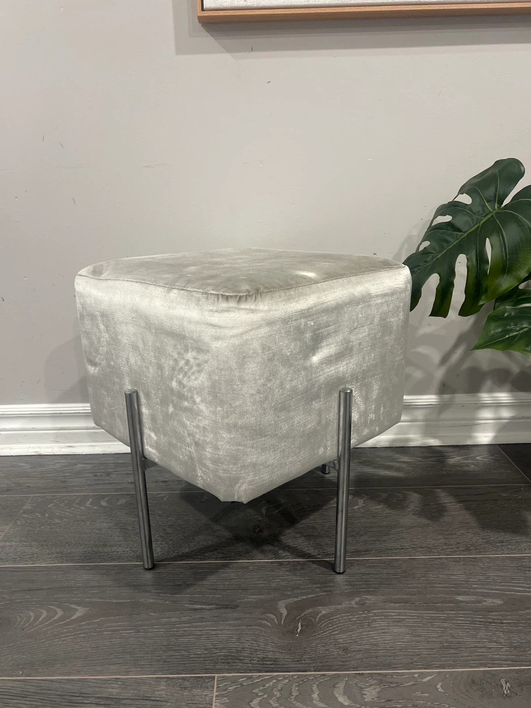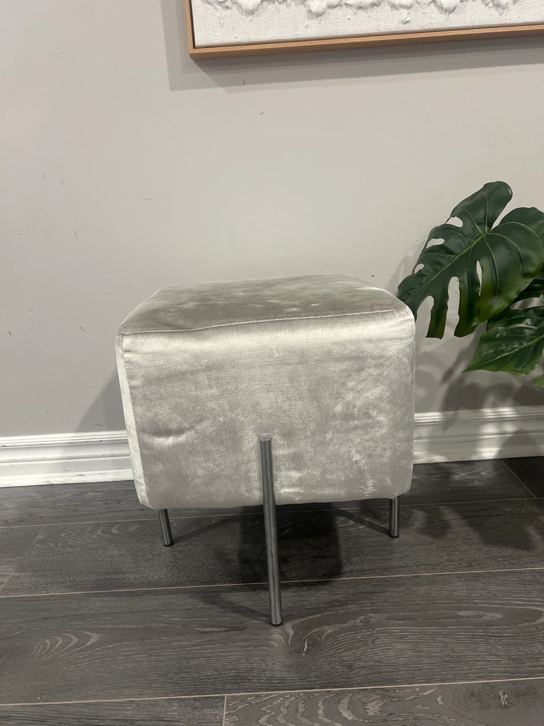Selling a stylish silver velvet ottoman footstool! It's in great condition and would look lovely in any living room or bedroom. The soft velvet material adds a touch of luxury, and the silver legs give it a modern look