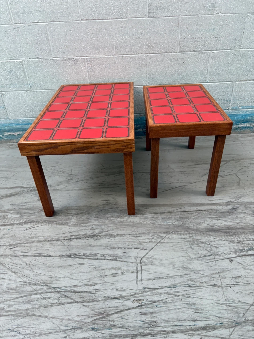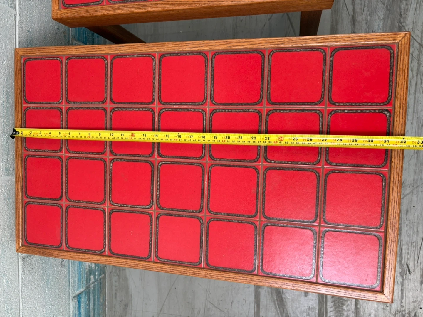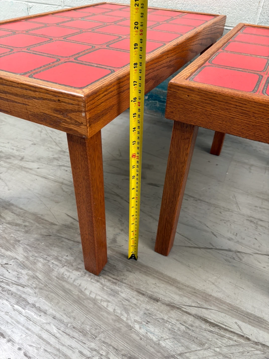 🧡like mew Set of Two Red Tile Top End Tables Selling a set of two end tables with a unique red tile top design! They have a warm wood frame and legs. These tables would add a pop of colour to any room! Measurements in last couple of pics $100 Pick up Victoria Park & O’Connor area