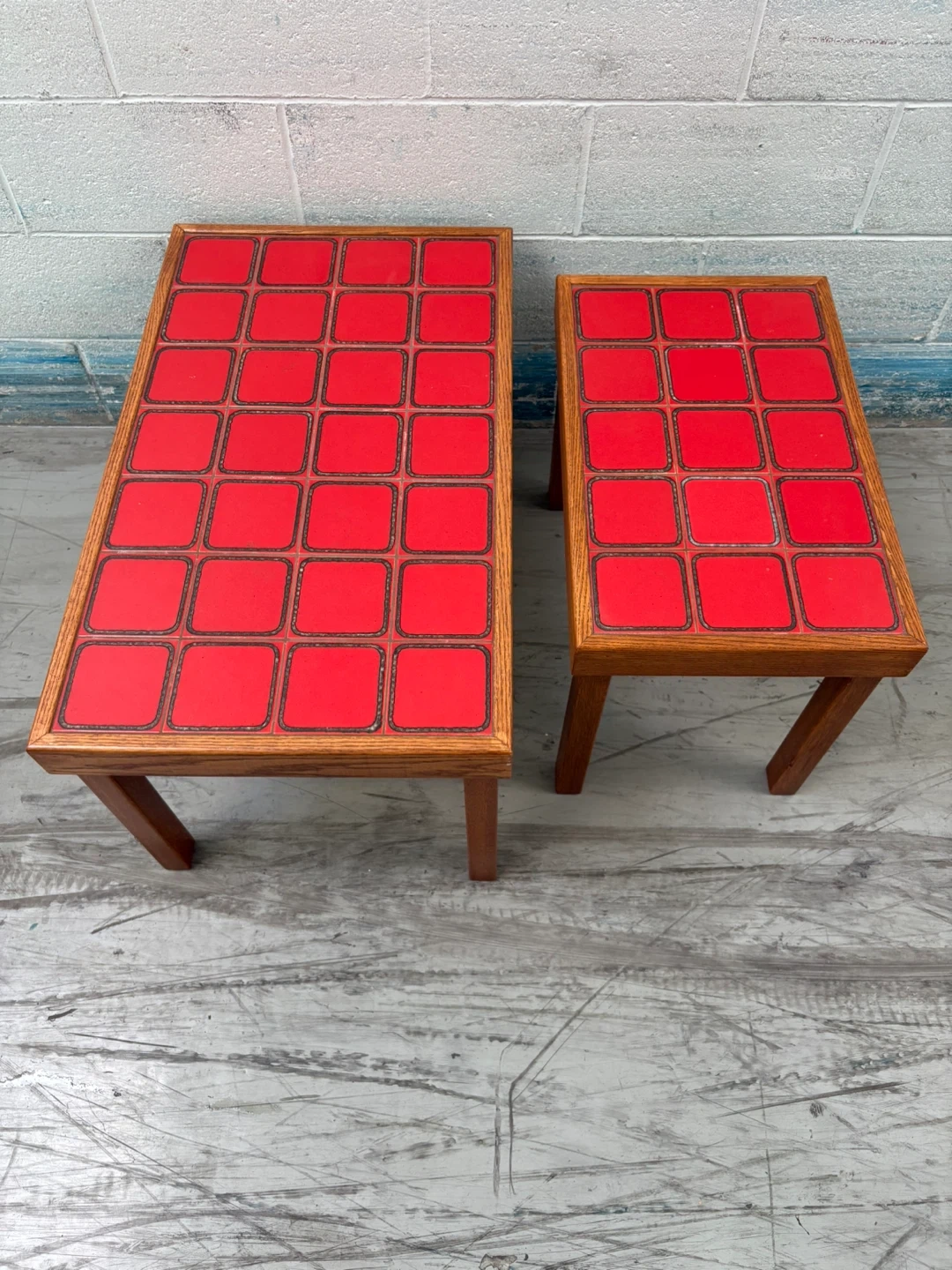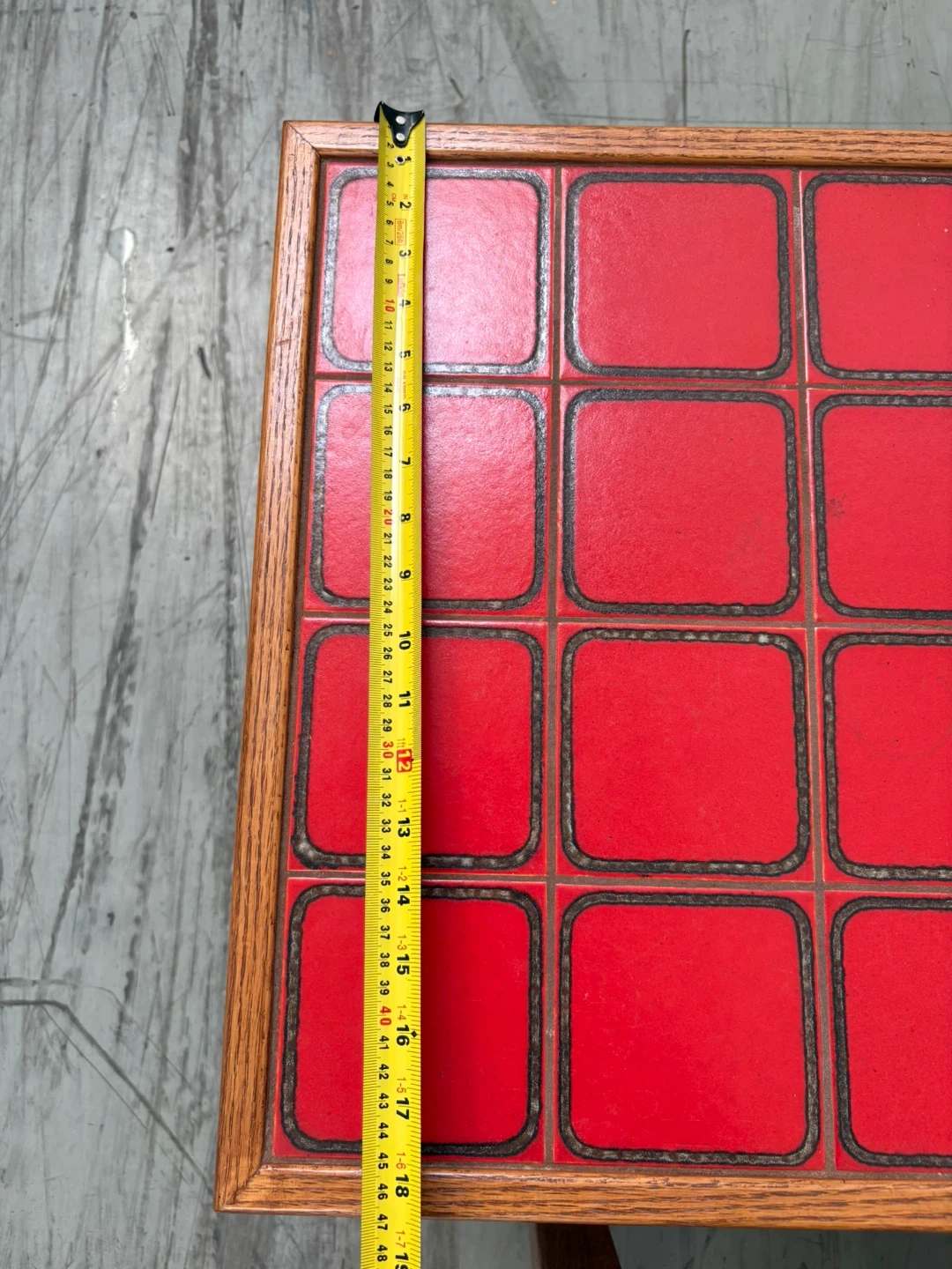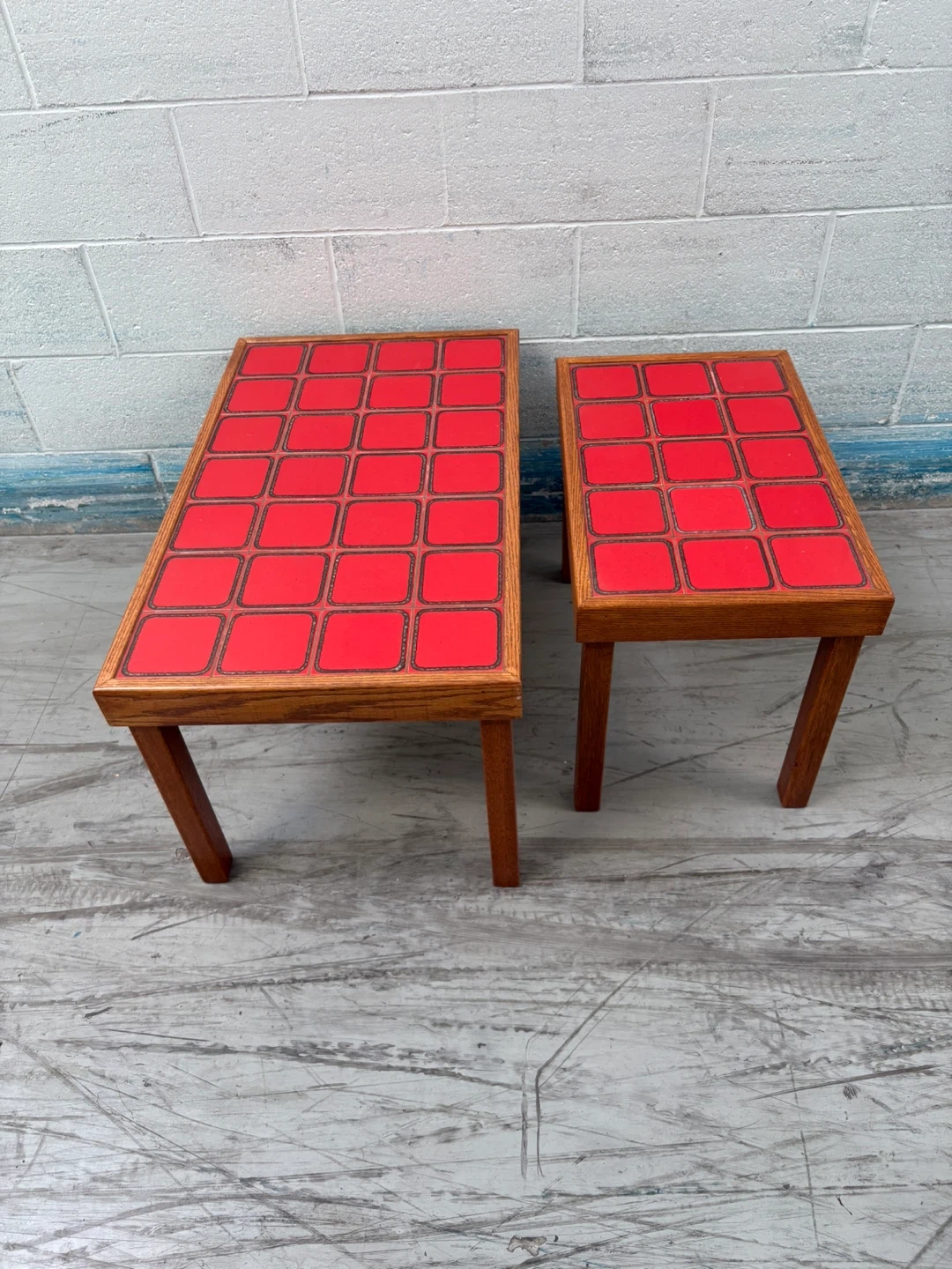 🧡like mew Set of Two Red Tile Top End Tables Selling a set of two end tables with a unique red tile top design! They have a warm wood frame and legs. These tables would add a pop of colour to any room! Measurements in last couple of pics $100 Pick up Victoria Park & O’Connor area