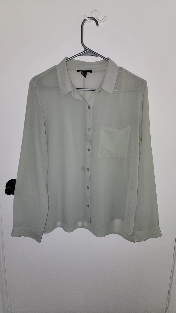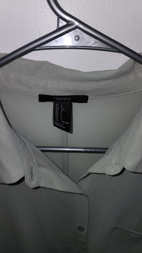 Selling a light green, long-sleeved button-up shirt from Forever 21 in size large. It's in great condition and ready for a new home!