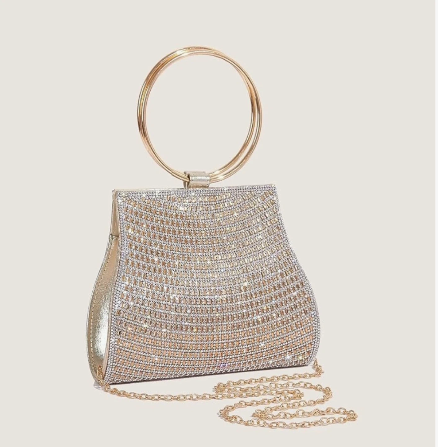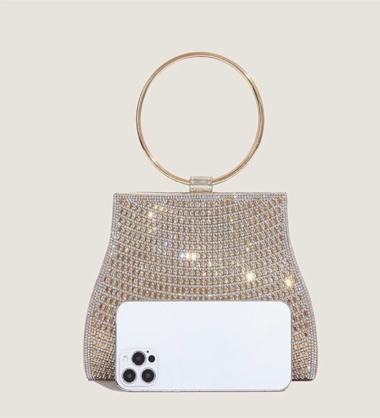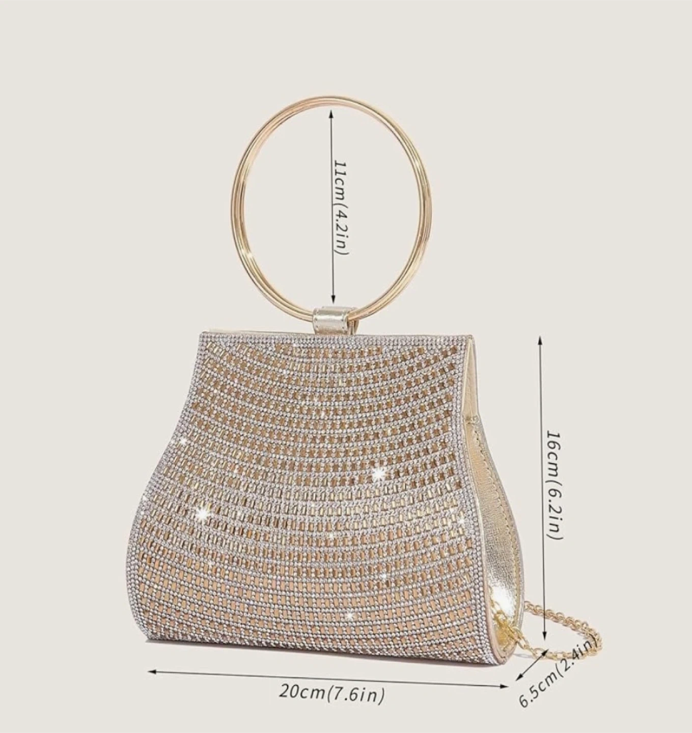 This is a beautiful gold evening bag with a ring handle! It's adorned with rhinestones for a touch of sparkle. The dimensions are approximately 20cm (7.6in) in width, 16cm (6.2in) in height, and 6.5cm (2.54in) in depth, with a handle height of 11cm (4.2in)