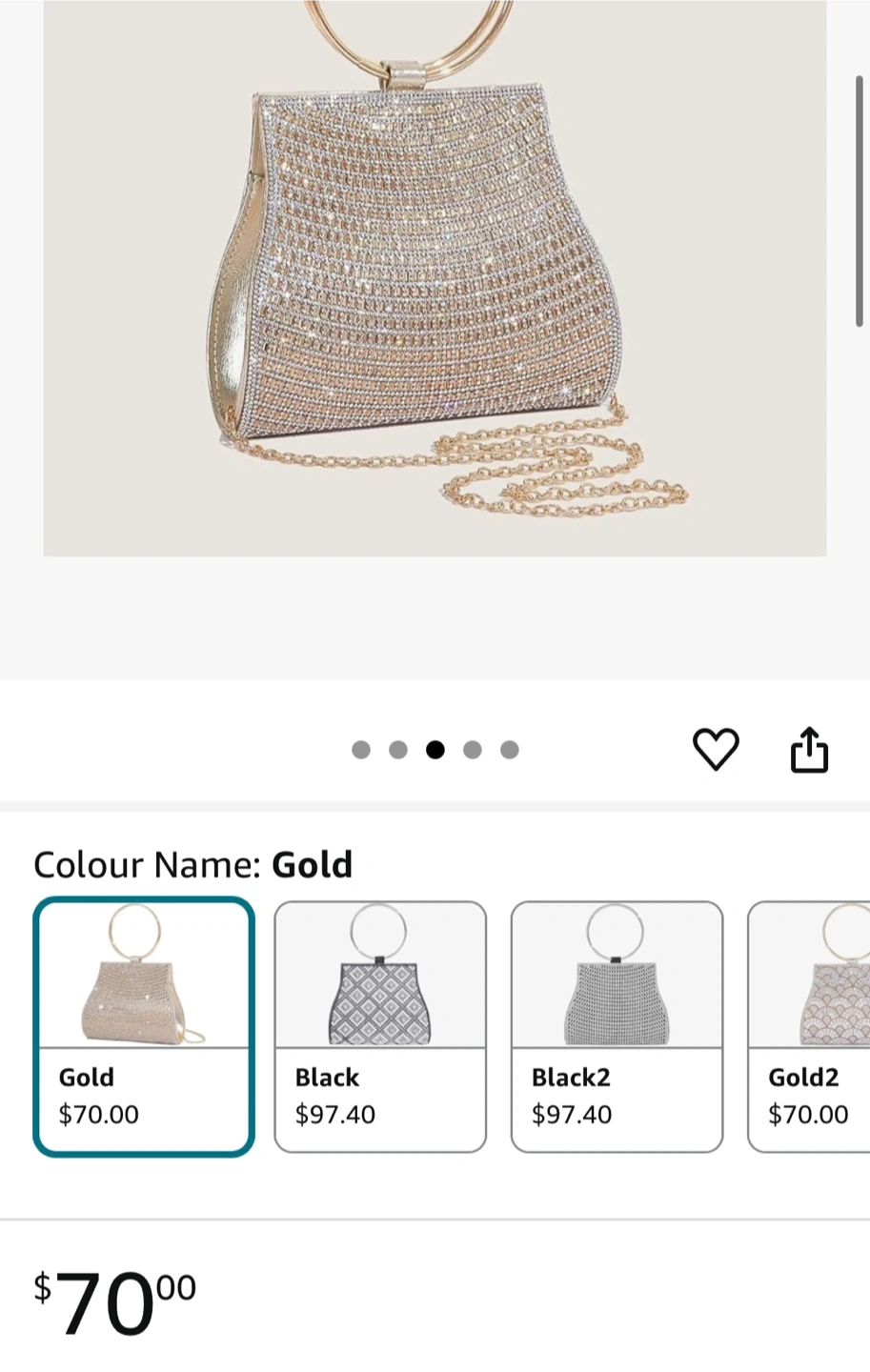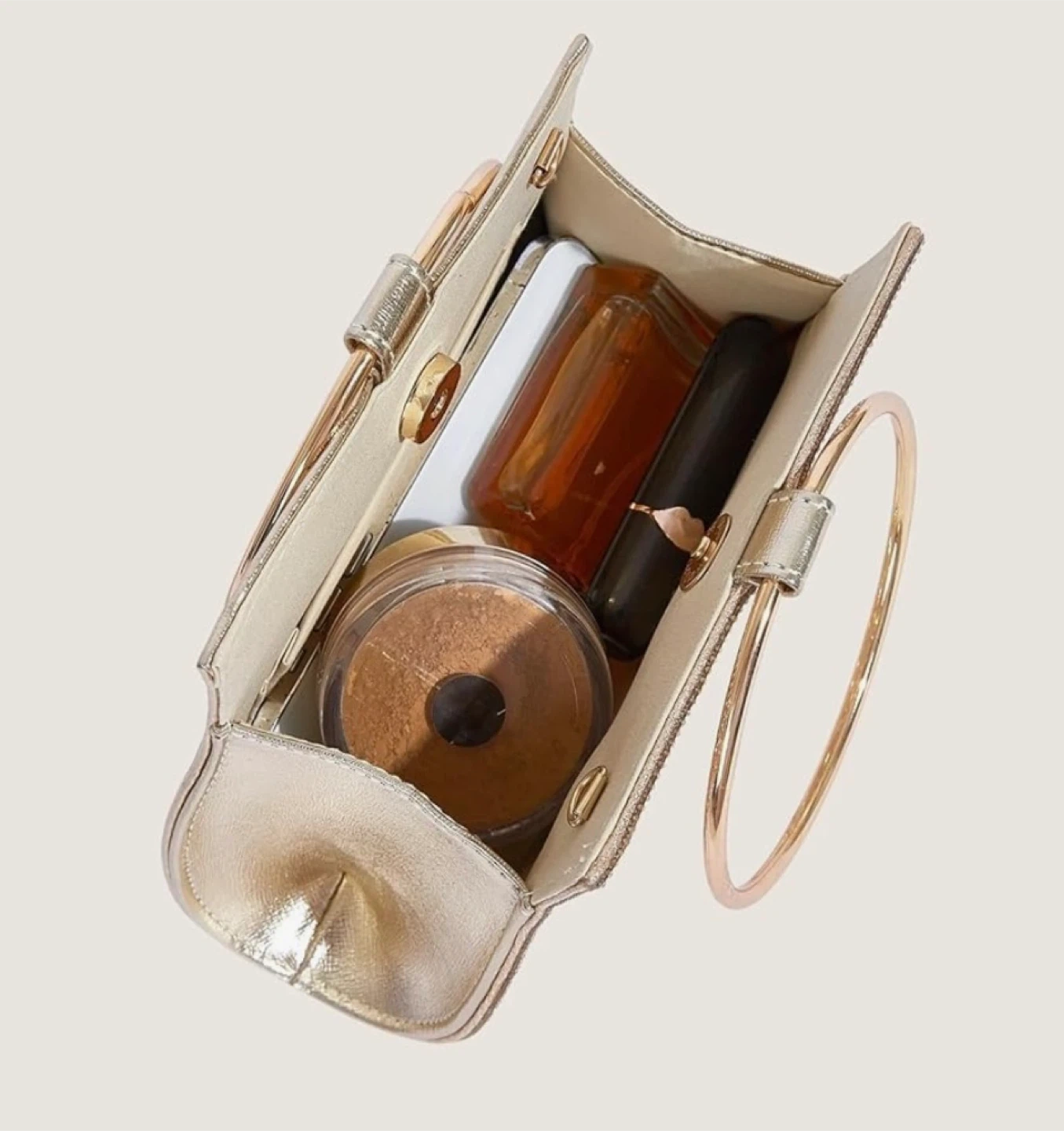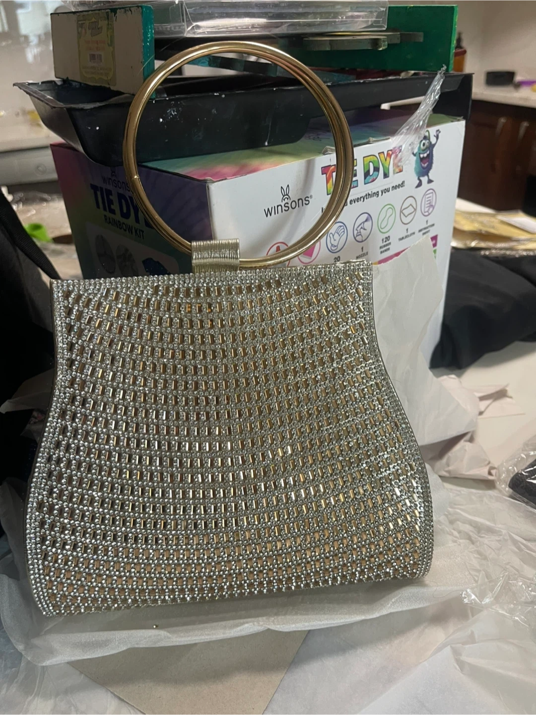 This is a beautiful gold evening bag with a ring handle! It's adorned with rhinestones for a touch of sparkle. The dimensions are approximately 20cm (7.6in) in width, 16cm (6.2in) in height, and 6.5cm (2.54in) in depth, with a handle height of 11cm (4.2in)