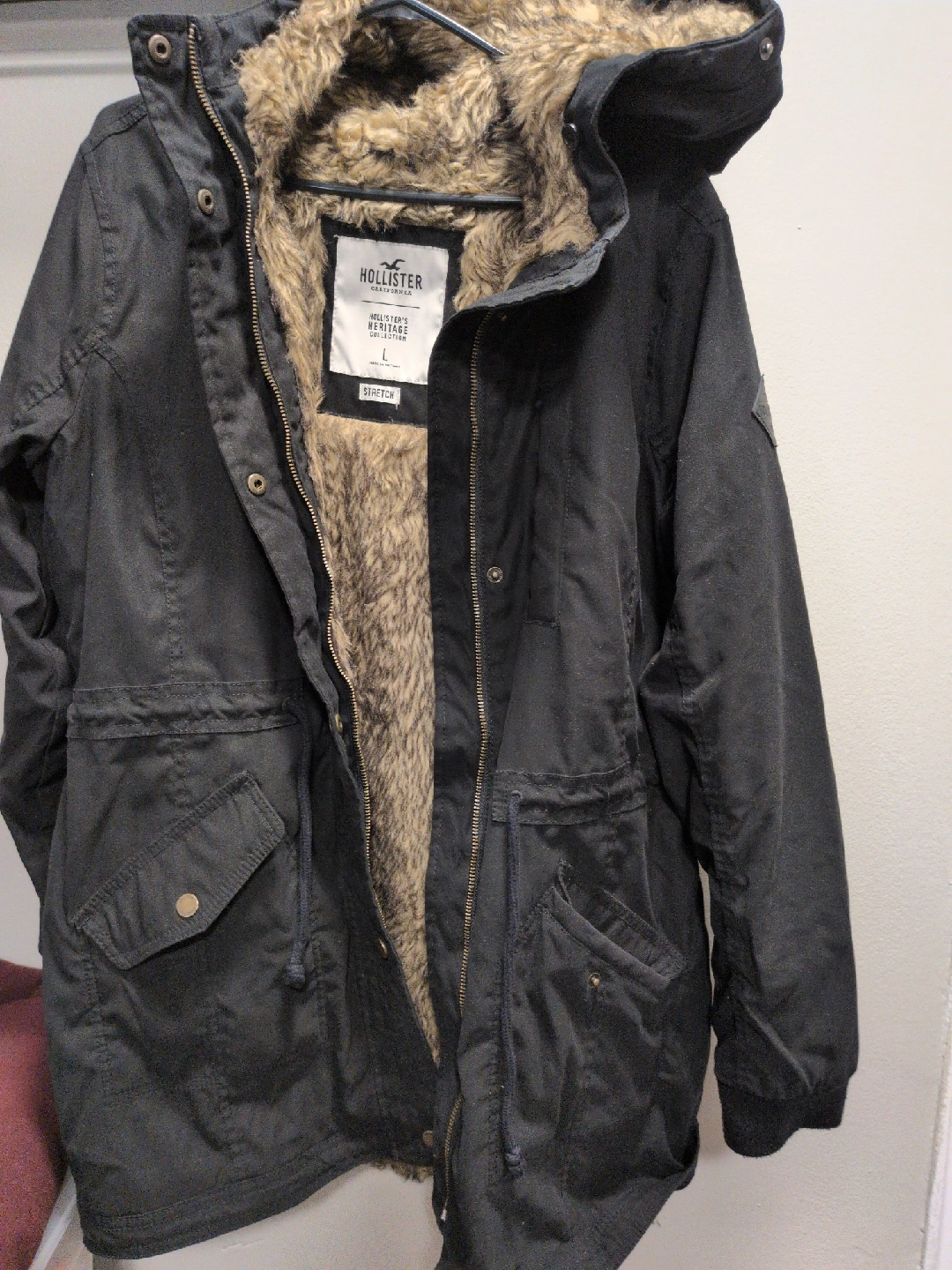Selling a Hollister Heritage Collection parka in size L. It's a stylish and warm jacket, perfect for the colder months. The parka features a faux fur lining and a durable outer shell. It's in great condition and ready for a new owner!