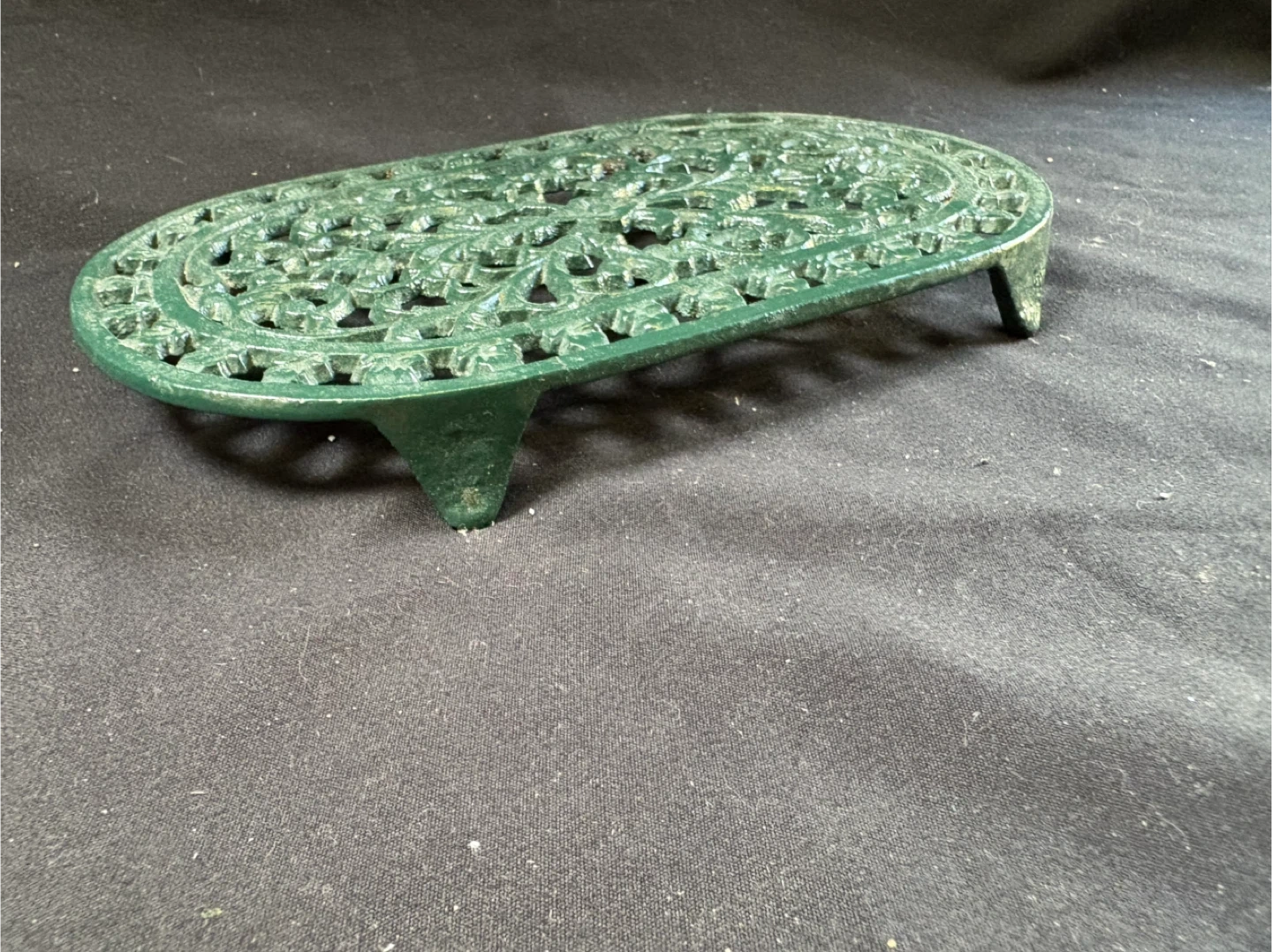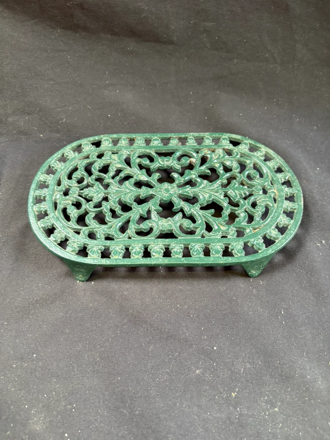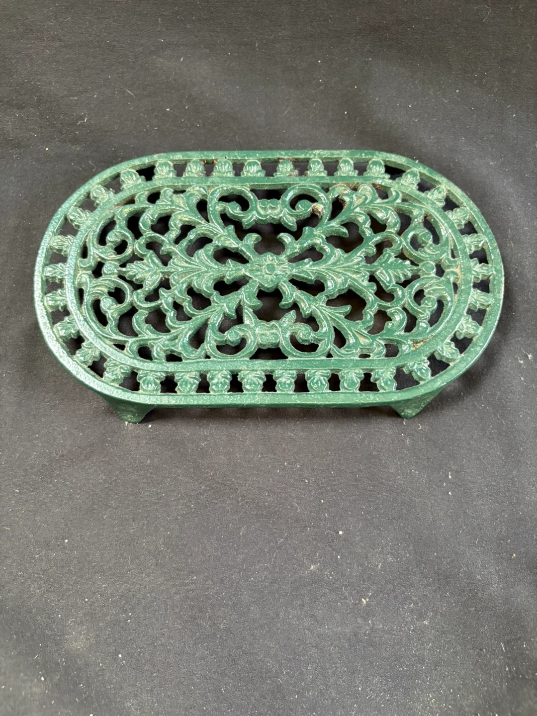 🧡like new Green Oval Cast Iron Trivet Here's a green oval cast iron trivet, perfect for protecting your surfaces from hot pots and pans! It features a lovely floral design and sturdy construction Measurements in last couple of pics $5 Pick up Victoria Park & O’Connor area