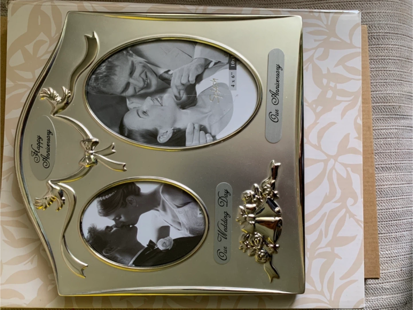 Selling a lovely picture frame from Mirror Mirror, perfect for displaying cherished anniversary or wedding photos! It's designed to hold two 4x6" and 10x10" photos. It's in great condition and comes with its original box