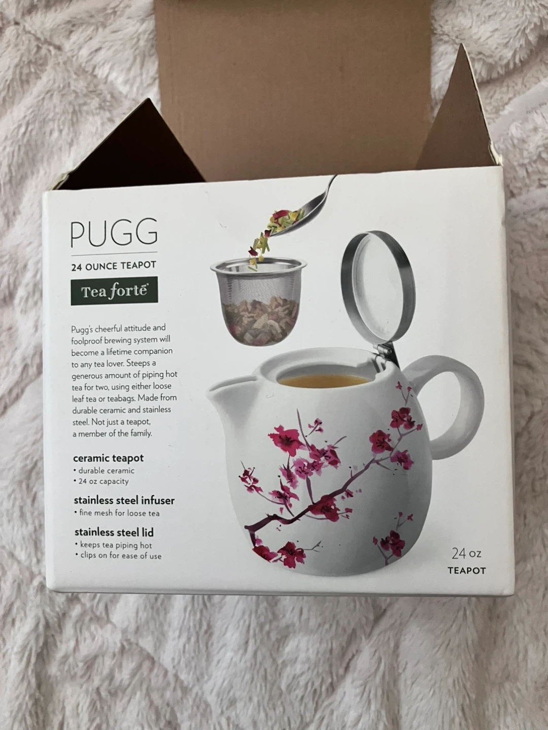 Selling a Pugg 24 ounce Tea Forte teapot! It's a lovely ceramic teapot with a stainless steel infuser and lid. The infuser has a fine mesh and the lid clips on easily. It keeps tea piping hot and has a 24 oz capacity. Comes with its original box