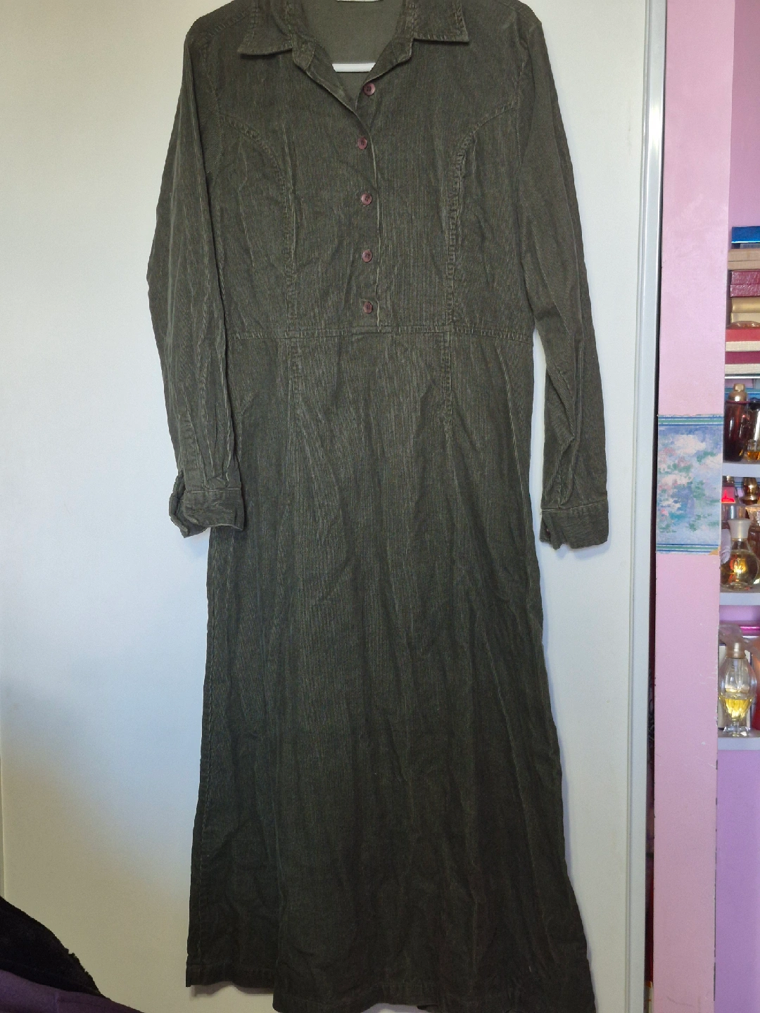 A lovely olive green corduroy dress, perfect for a casual or dressed-up look! It has a button-down front and a classic, comfortable style. It's in great condition and ready for a new home
