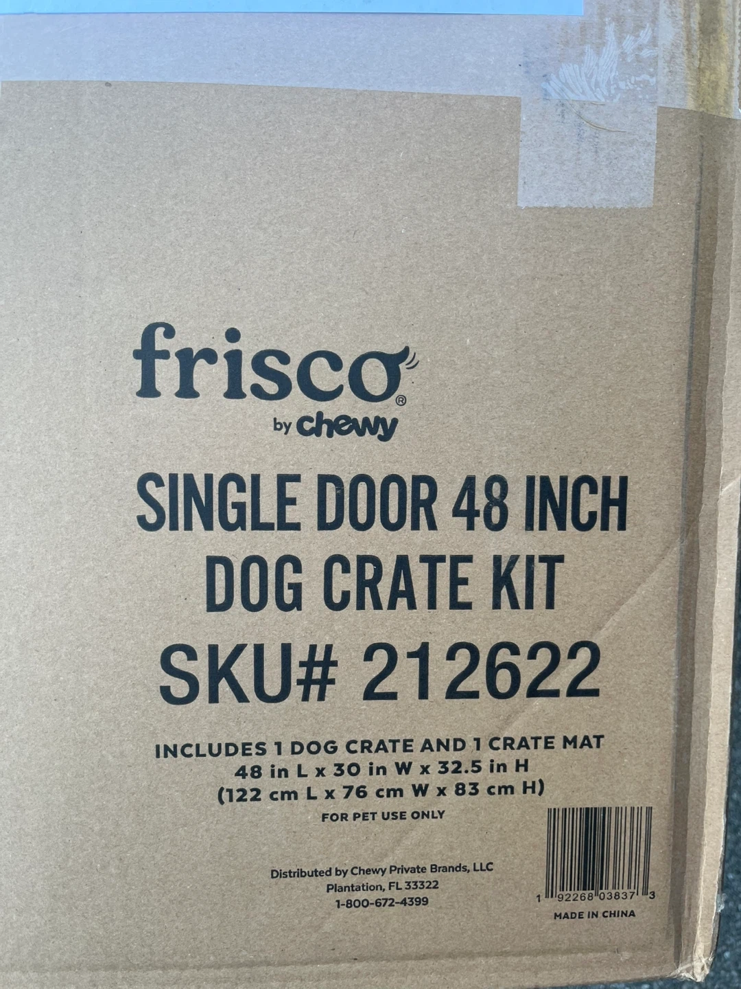 Selling a new in box XL Frisco Single Door 48-Inch Dog Crate Kit by Chewy. It includes 1 dog crate and 1 crate mat. The dimensions are 48 in L x 30 in W x 32.5 in H (122 cm L x 76 cm W x 83 cm H).