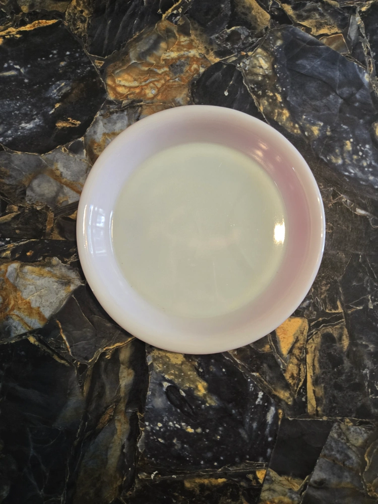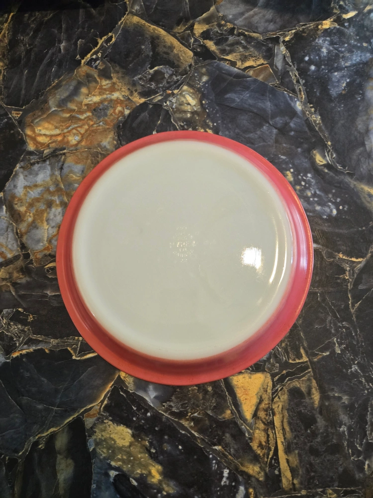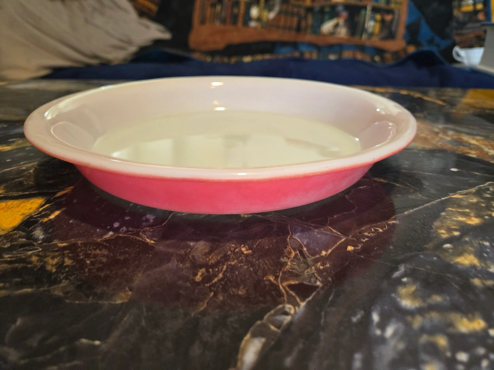 Selling a vintage Fire King pie plate. It's a lovely pinky peach lustre colour with a white interior. Perfect for adding a touch of retro charm to your kitchen!