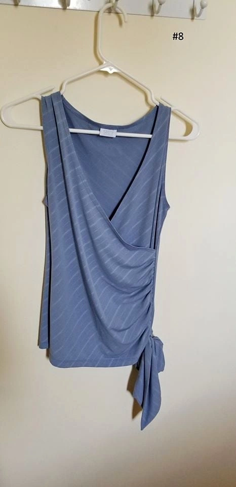 Blue striped wrap top with ruching detail. In medium. ($5) Pick up at Keele/Lawrence.