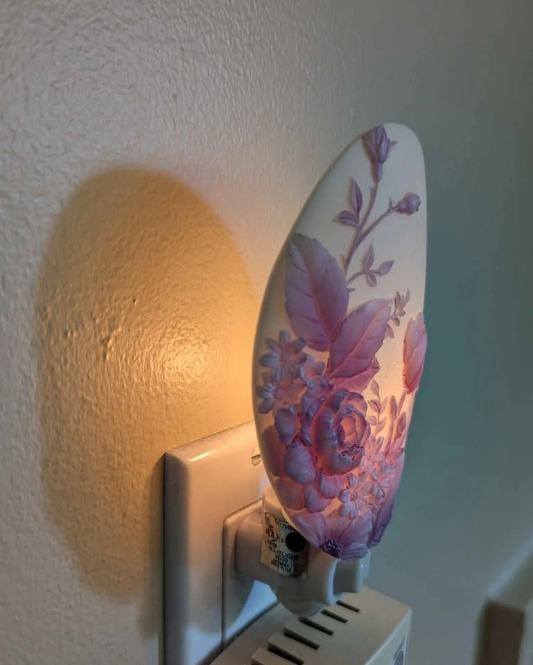Cozy vintage nightlight, working, beautiful textured floral pattern.