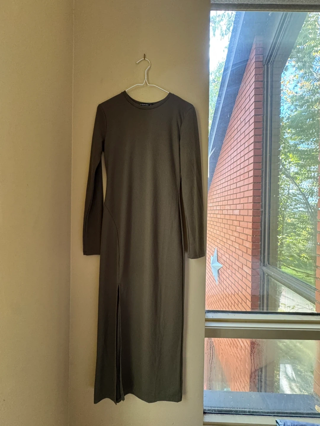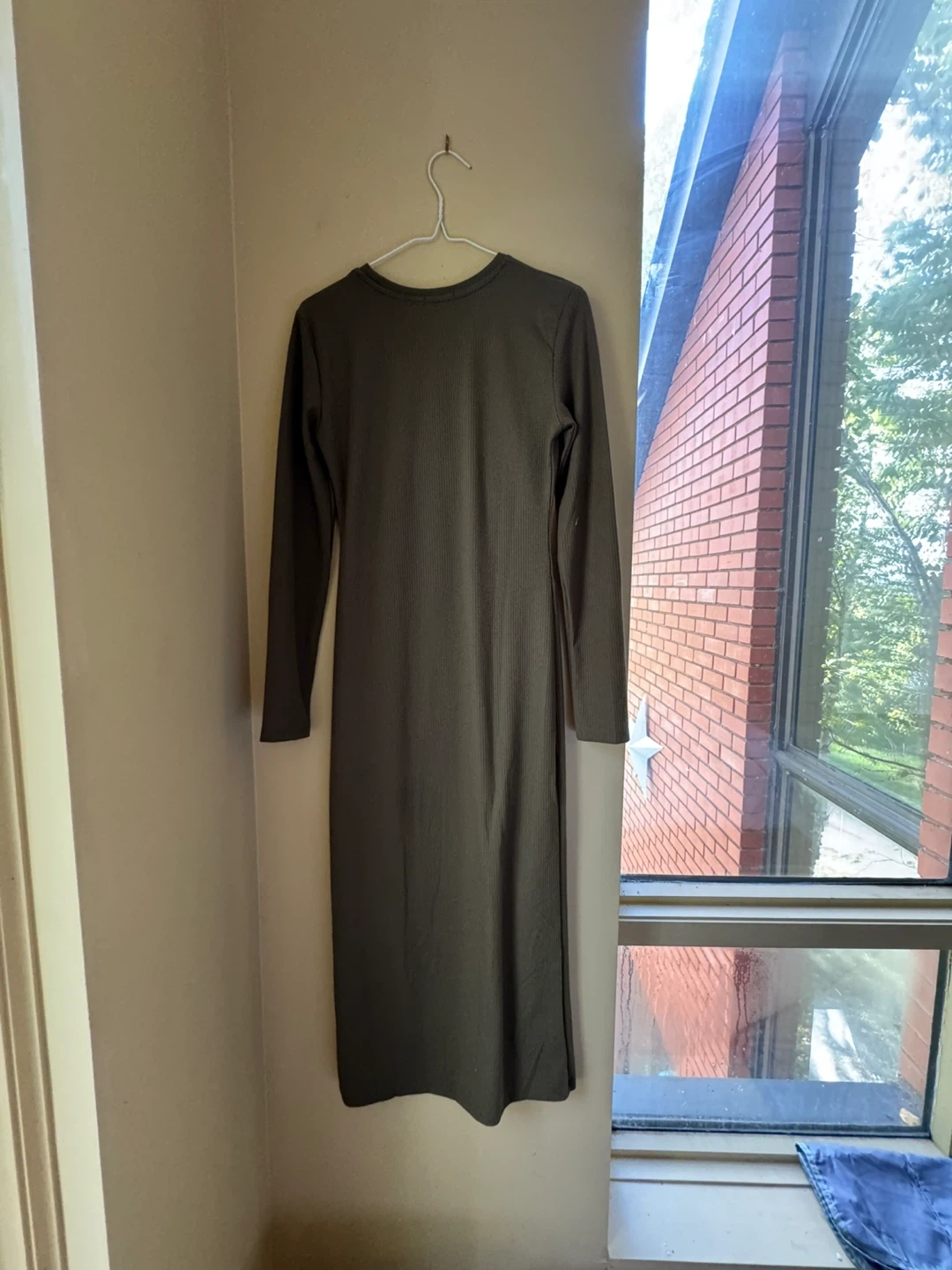 Selling a Stradivarius ribbed midi dress in olive green! It's a size small and in great condition. Perfect for a casual day out or dressed up for an evening. The material is soft and comfortable, and the ribbed texture adds a nice touch. It has a slit on one side. Never worn. New without label!