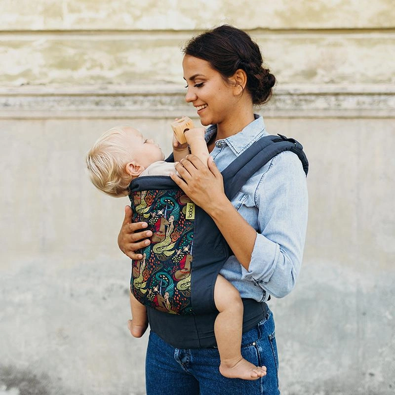 We have two Baba baby carriers. They are practically unused because we had twins and I could not carry two at once! One carrier is dark brown with colorful birds, as seen in the photo attached, the other is light grey with flowers.