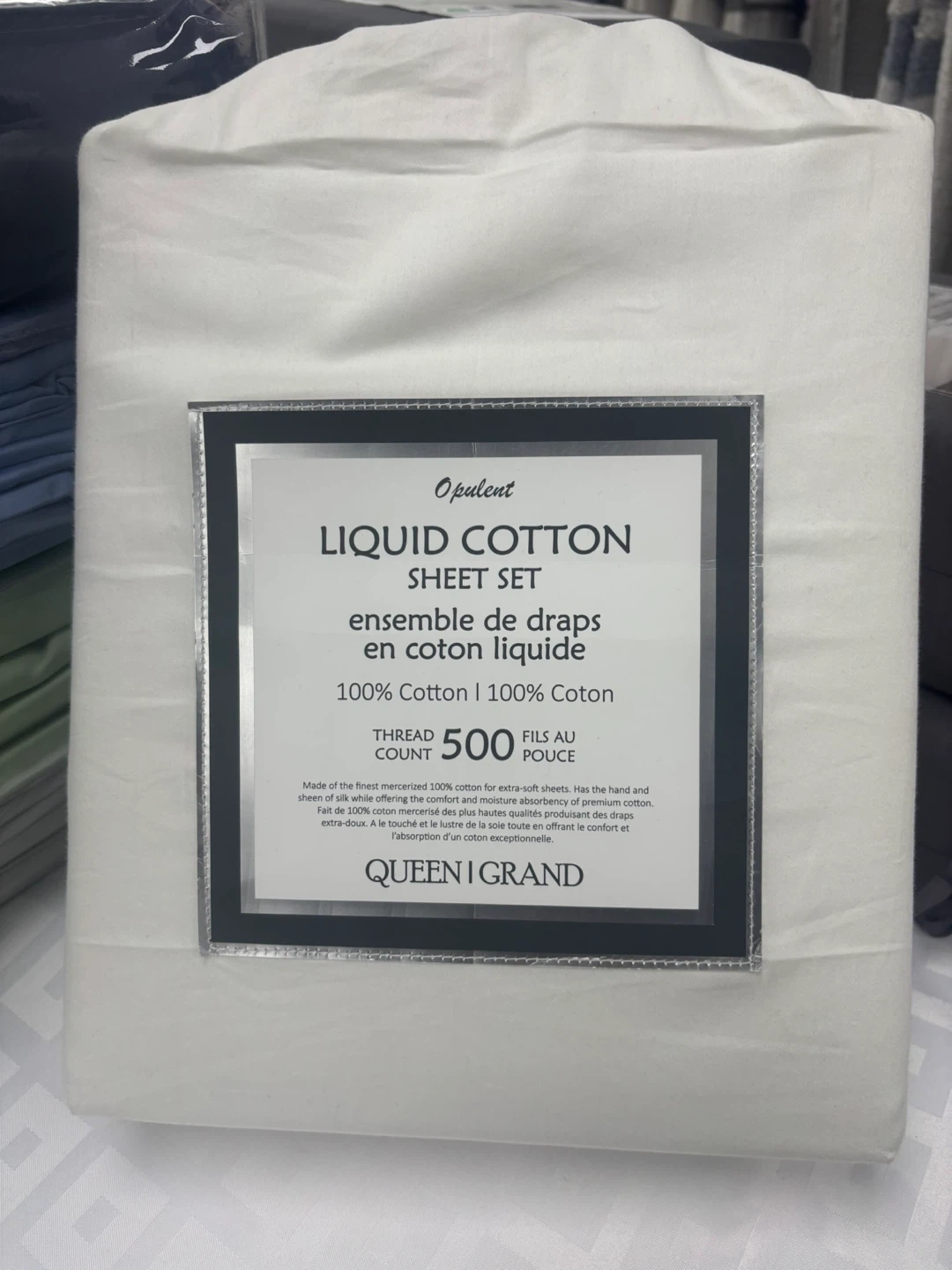 Selling an Opulent Liquid Cotton Sheet Set in Queen/Grand size. This set is made of 100% mercerized cotton with a 500 thread count, offering a soft and silky feel. It's brand new in its original packaging!