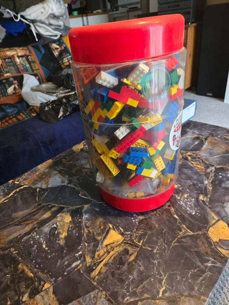 A container full of Lego blocks ready for a new home! Great for creative building and hours of fun