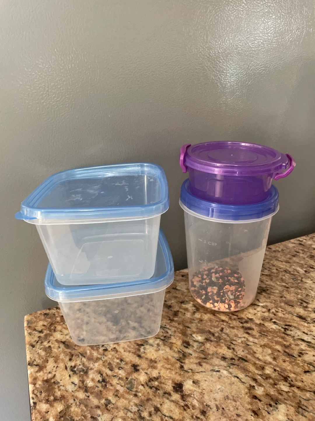 Selling a variety of kitchen containers. There are plastic containers with lids, glass jars, a blue plate, and a green bowl. Perfect for organizing your pantry or storing leftovers!