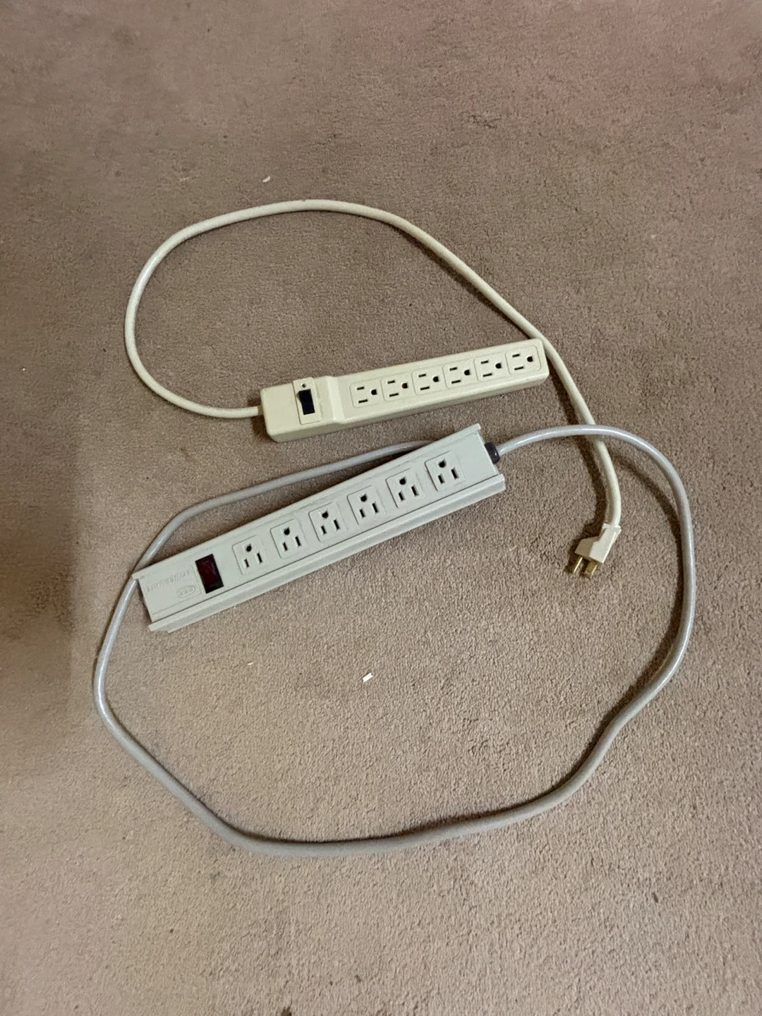 Two power strips available. One is a standard six-outlet strip with a switch, and the other is a multi-outlet strip with a red switch. Both are in good working condition.