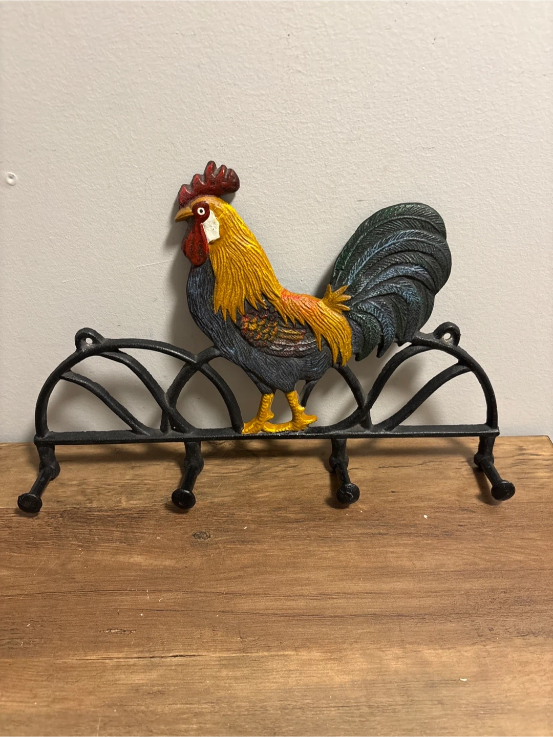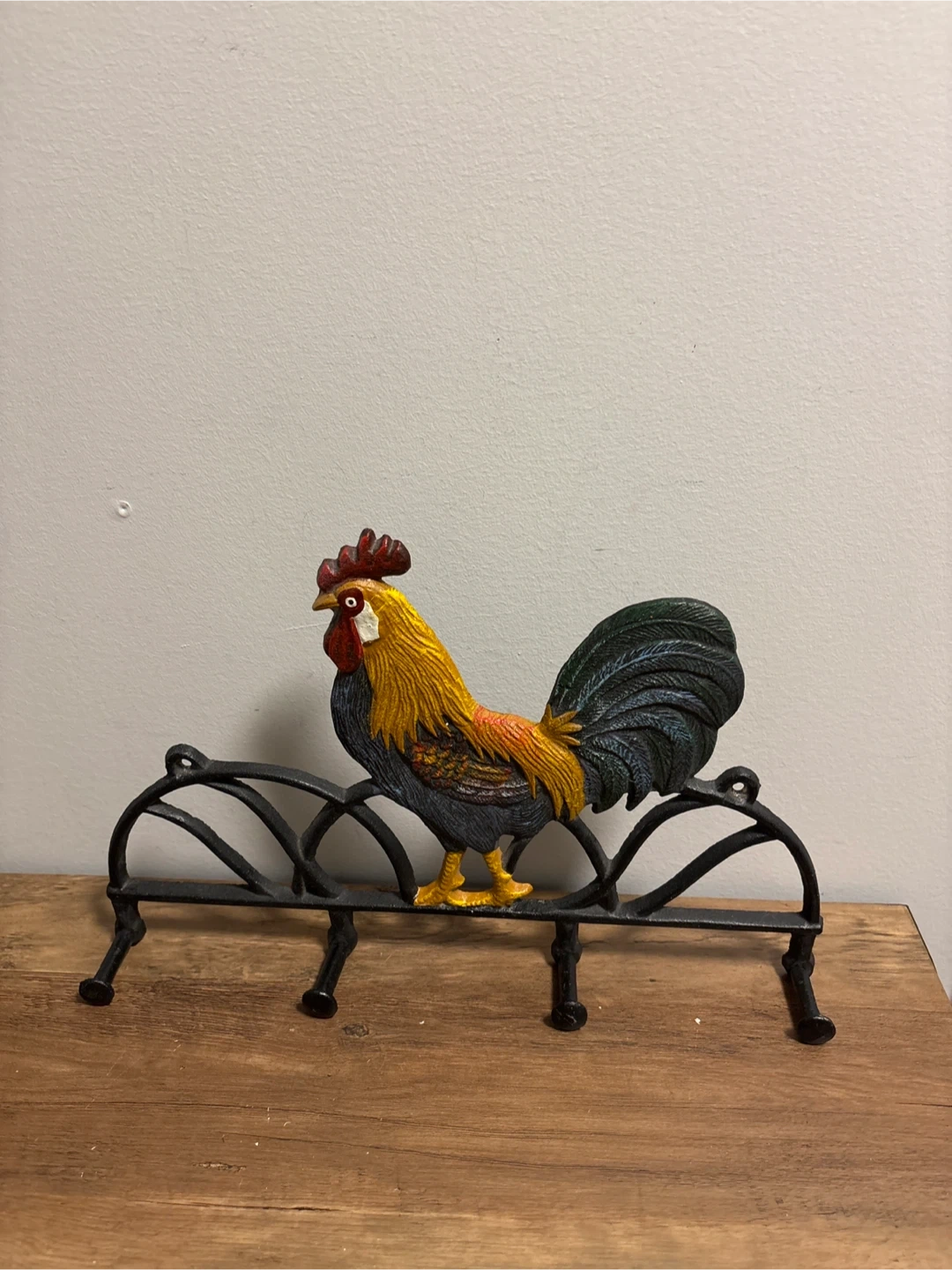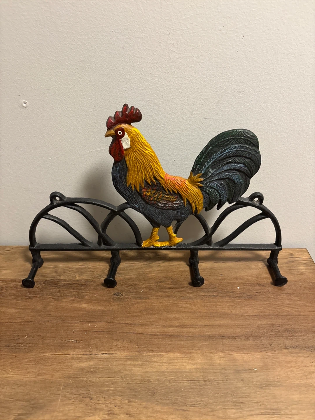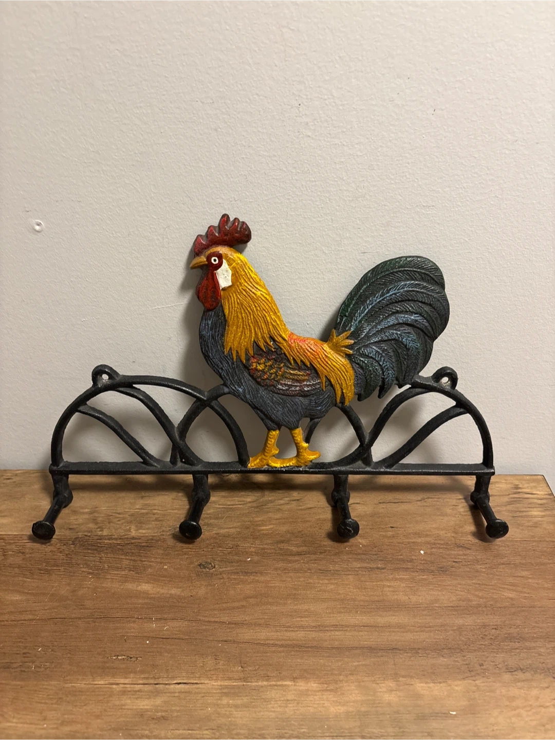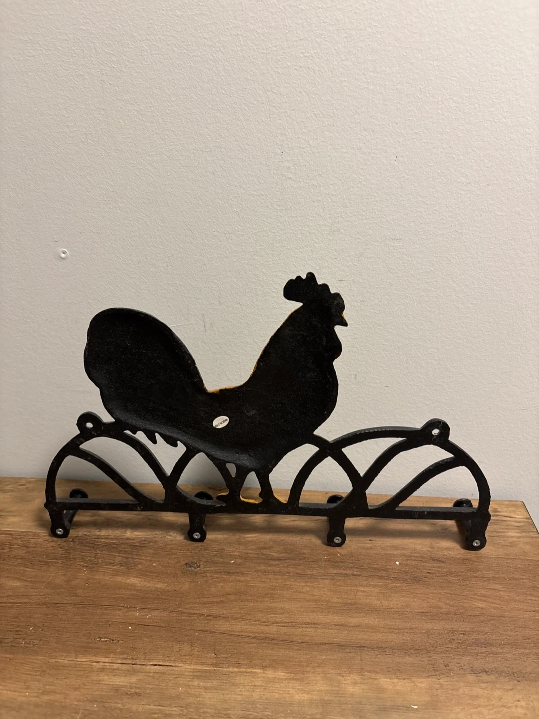 This is a rooster themed wall hook rack. It would be great for hanging keys or other small items. It is made of metal and has a black finish.