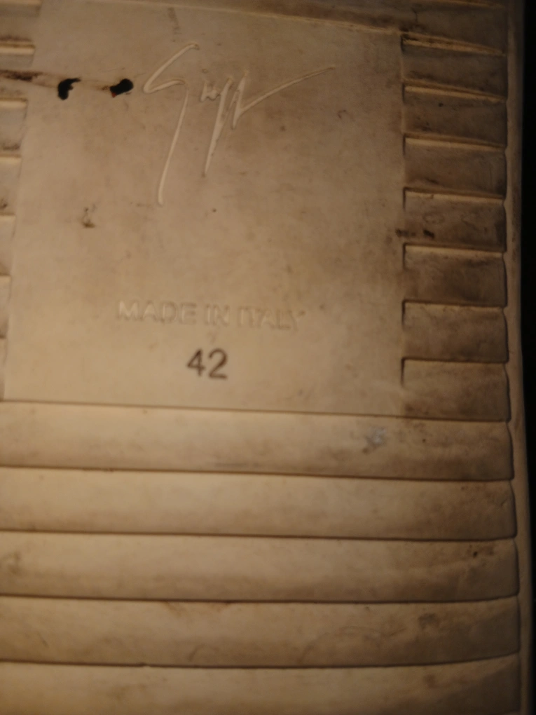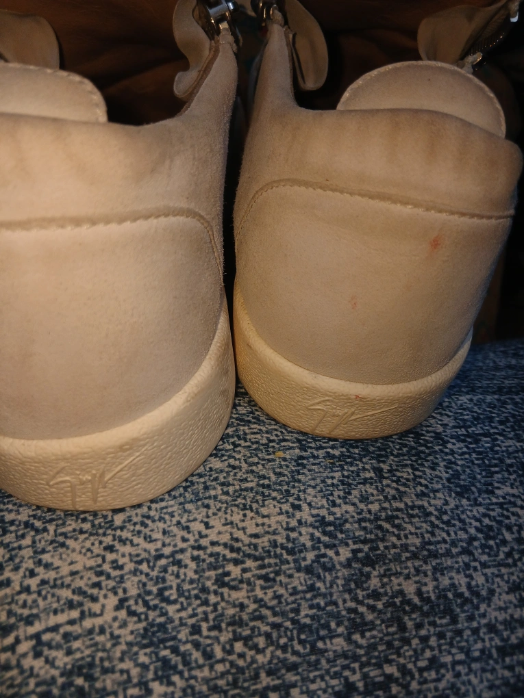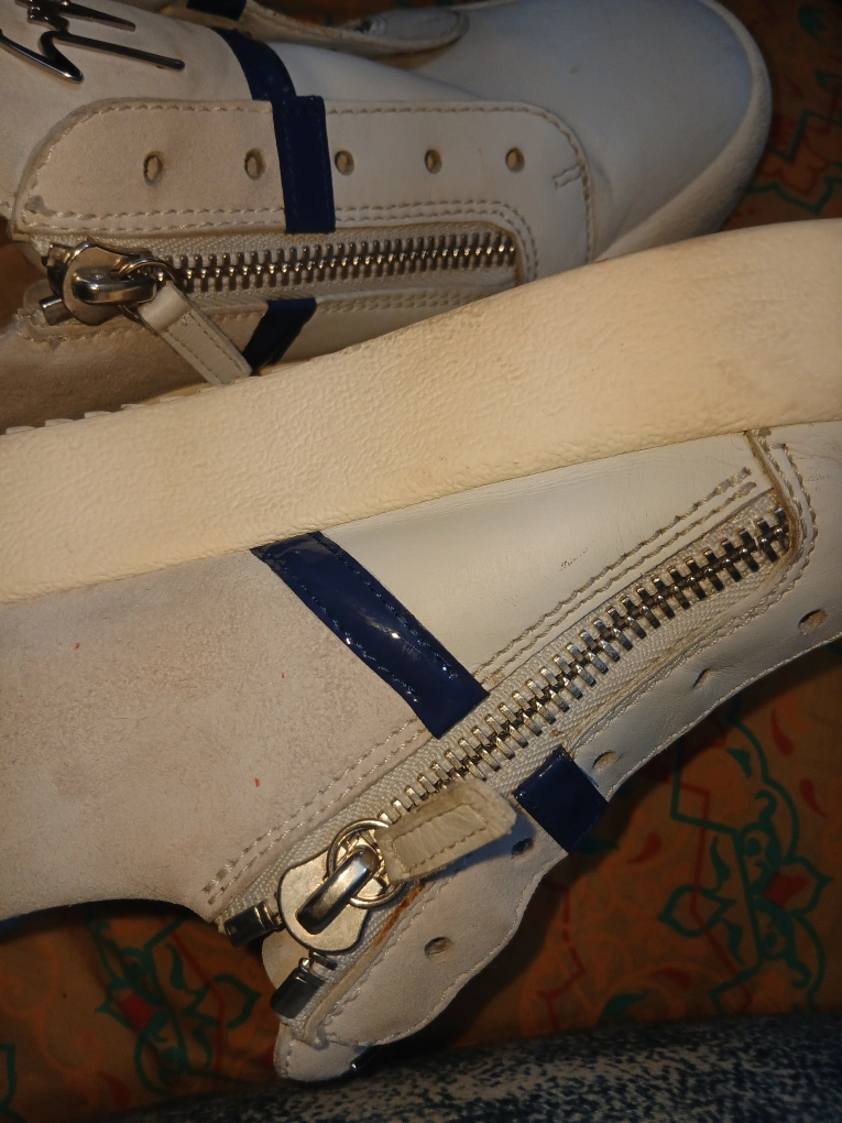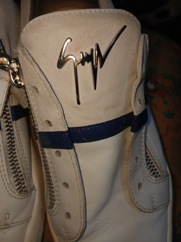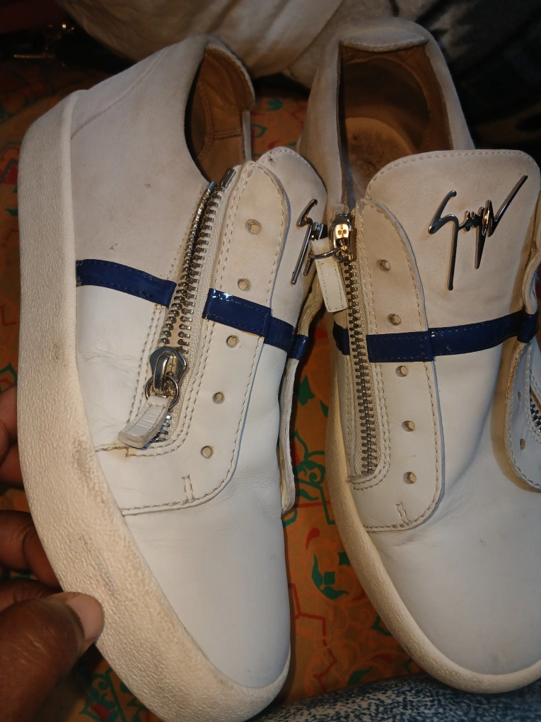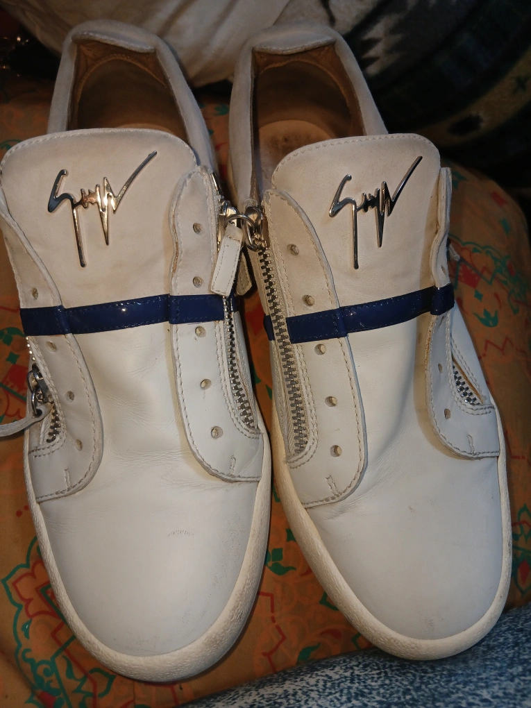 Selling a pair of Giuseppe Zanotti sneakers in a size 42. They're white with a blue stripe and feature the signature zipper detailing. There are some signs of wear, as shown in the photos.