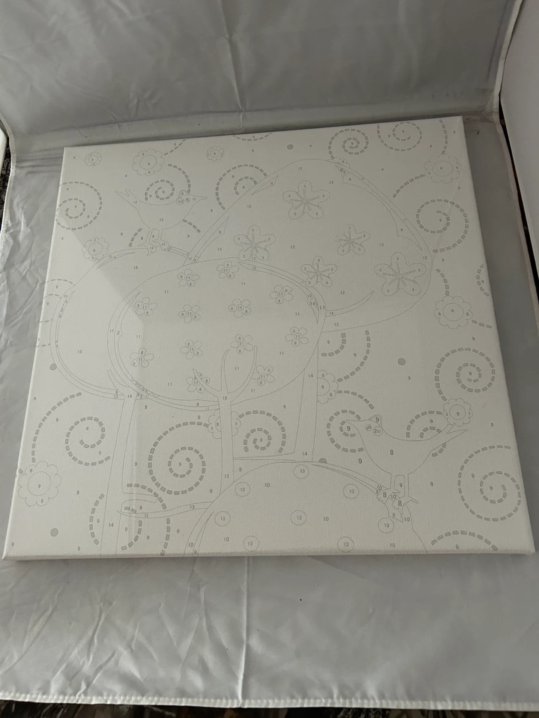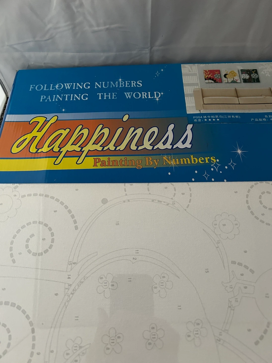 Get creative with this Happiness Painting By Numbers kit! Canvas with different pattern of numbered design. Set of numbered paints with a brush sold separately. $3 for each canvas only, $3 for set of paint. Take all for $10.