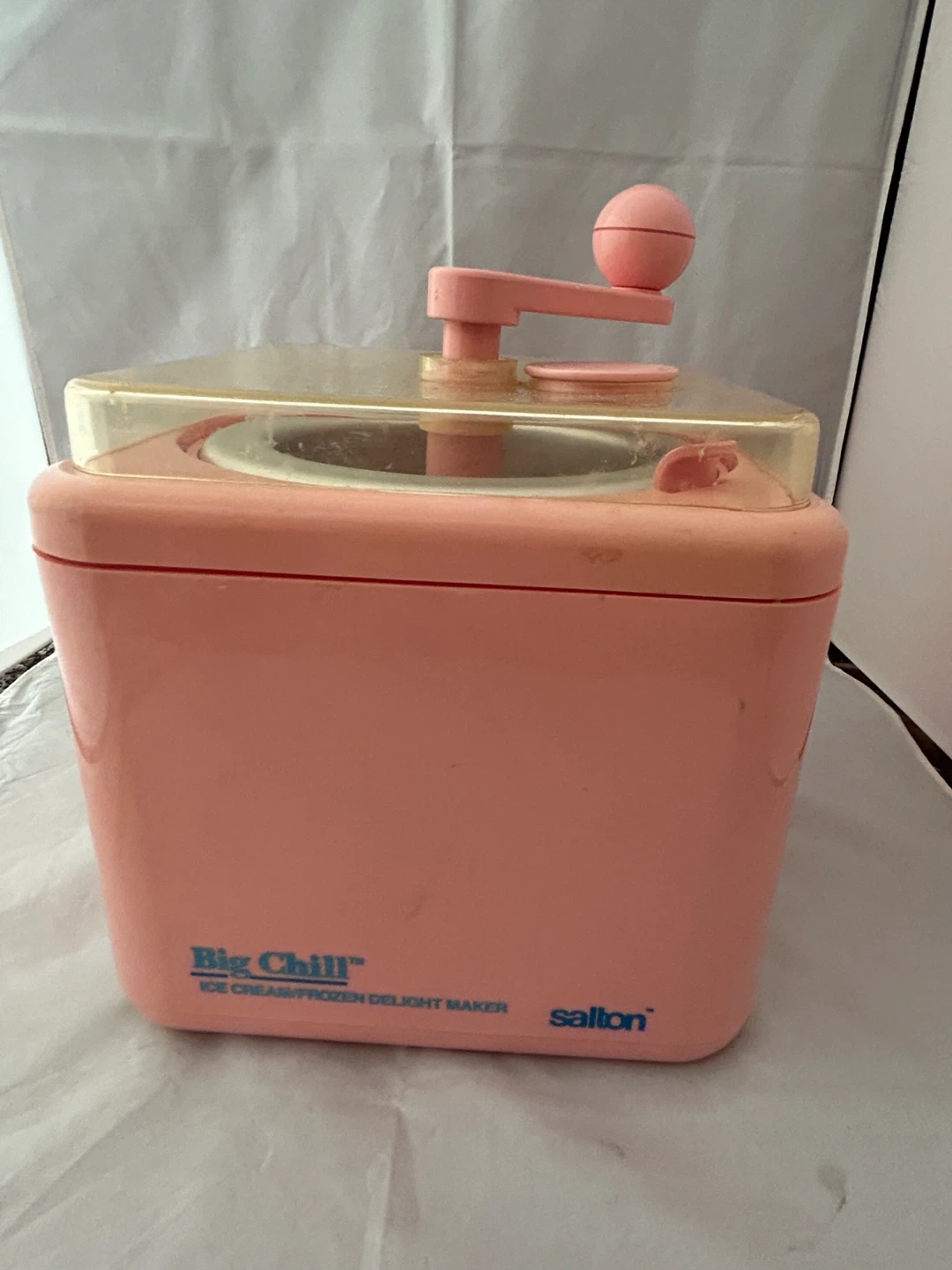 Get ready to make some delicious homemade ice cream with this vintage Salton Big Chill Ice Cream/Frozen Delight Maker! It's in a lovely pink colour and includes all the components you need to get started. Perfect for creating frozen treats at home!
