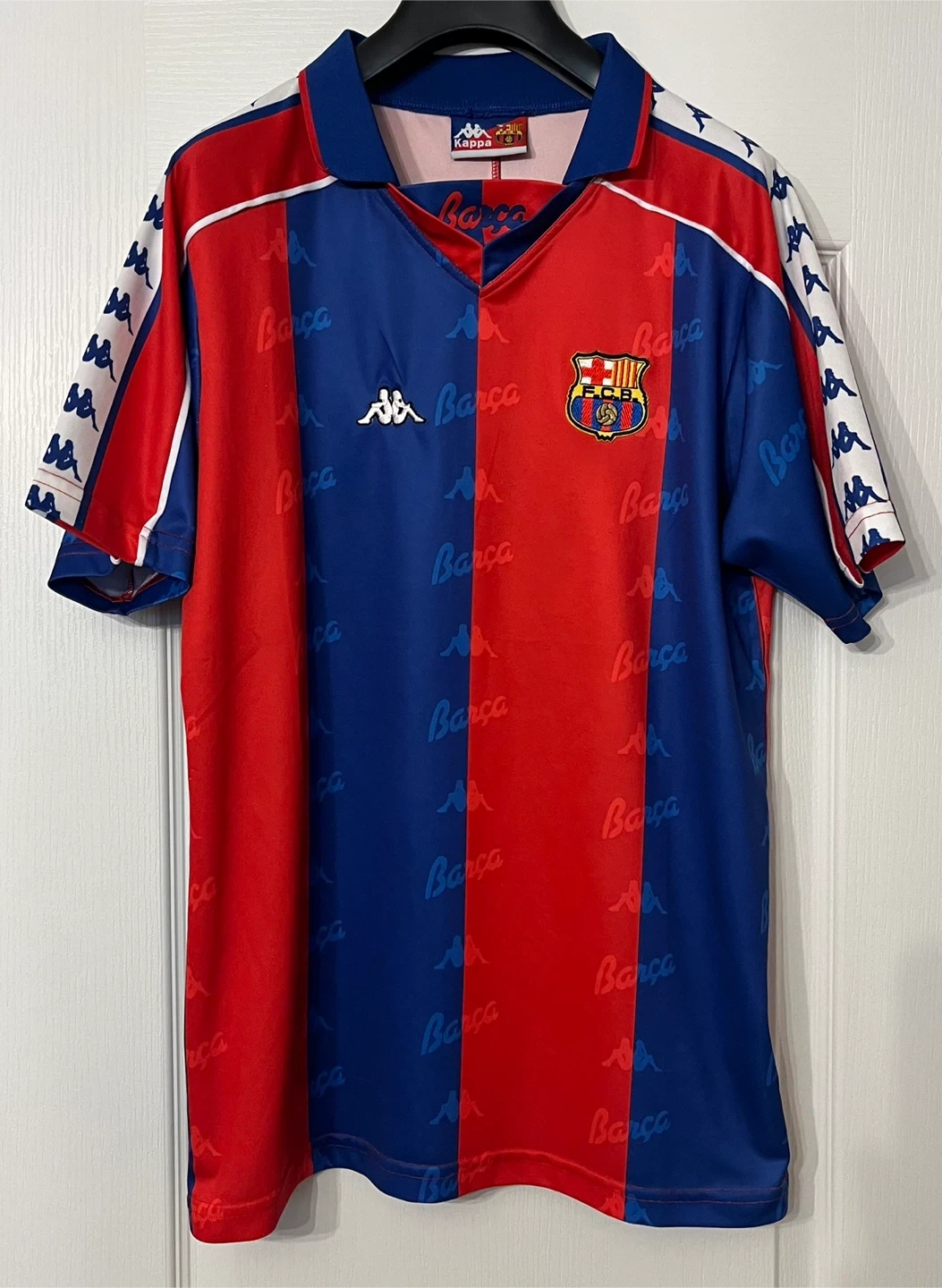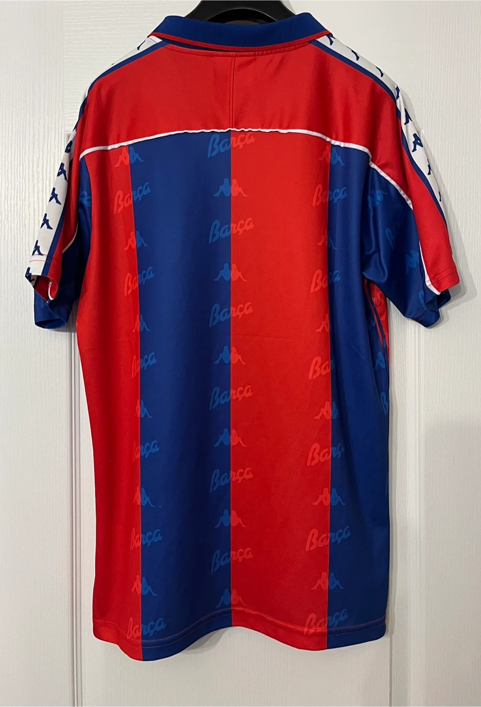 Vintage Kappa FC Barcelona jersey in a Men’s size Medium. The jersey features a unique design with the Kappa logo and the FC Barcelona crest. The colours are a vibrant red and blue. Pristine Condition.