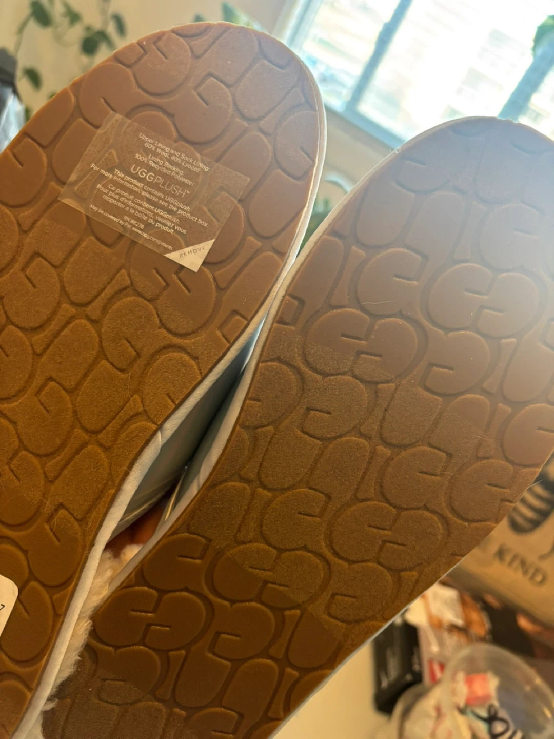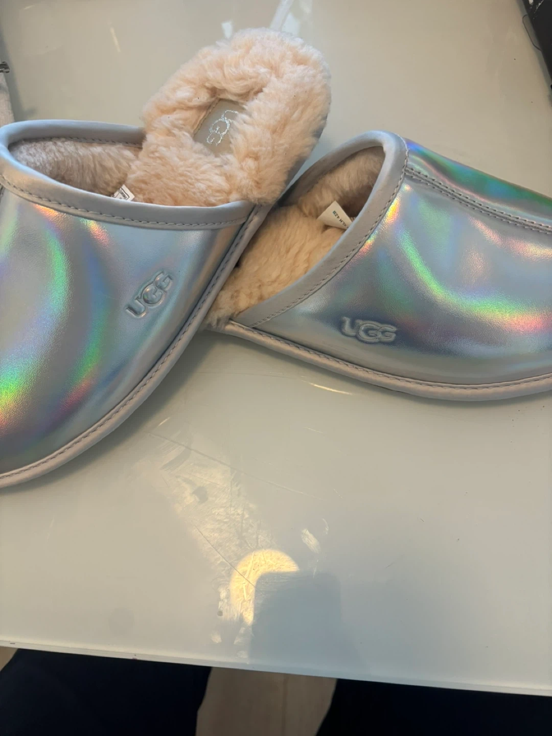 Brand New!!!! Selling a pair of UGG women's slippers in size 8. They're a unique silver colour and feature a plush lining for extra comfort. The soles have the UGG logo pattern. Perfect for keeping your feet cozy!