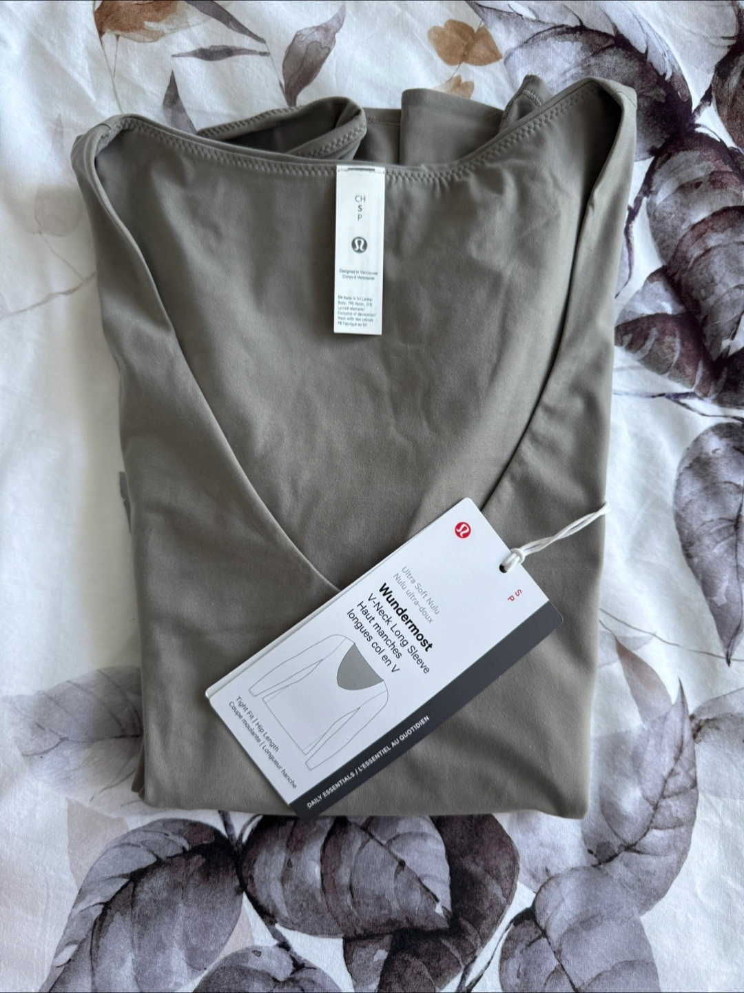 BRAND NEW Lululemon Undermost Ultra-Soft Nulu V-Neck Long-Sleeve Shirt in warm ash grey, size S. Originally bought for $78