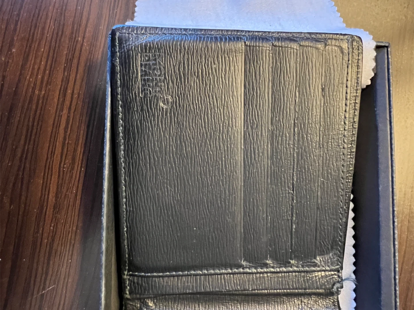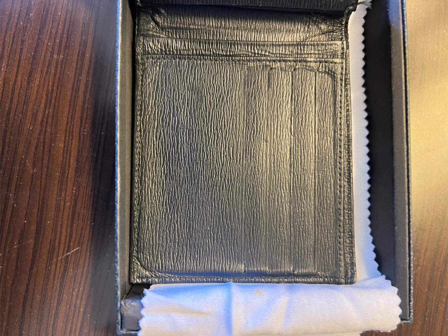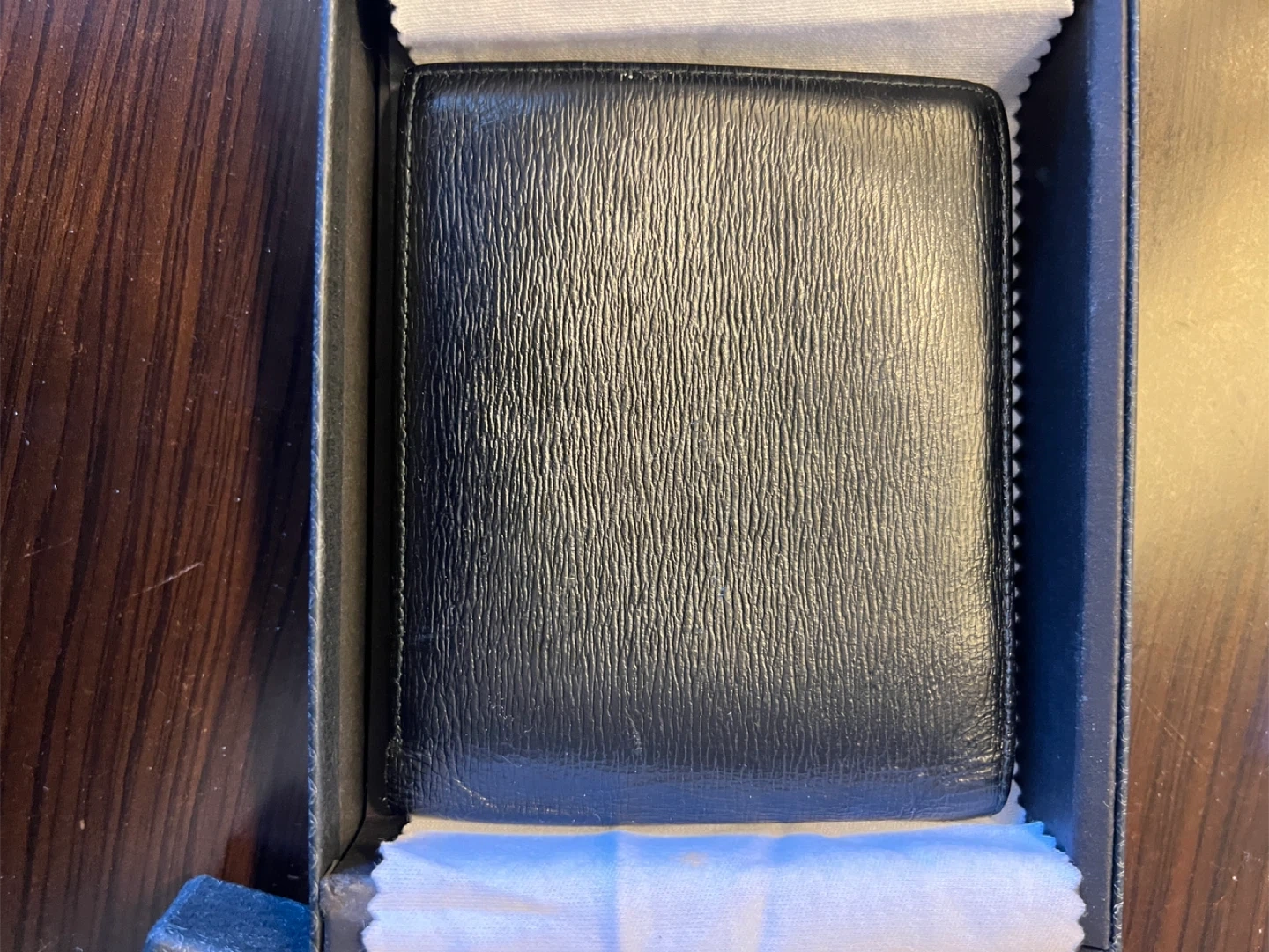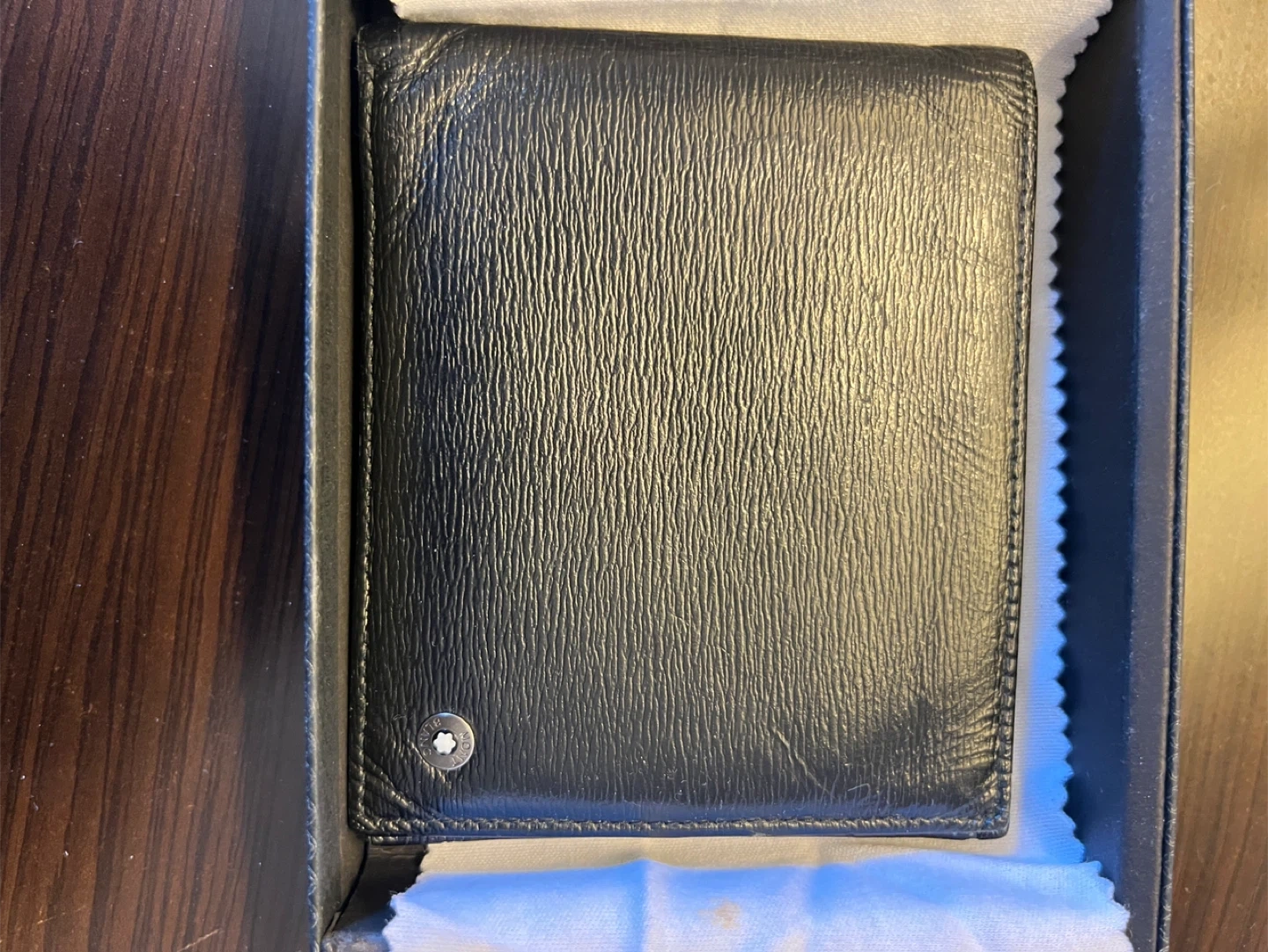 Selling a Montblanc black leather wallet. It's in great condition and comes with its original box and cleaning cloth. A stylish and functional accessory!
