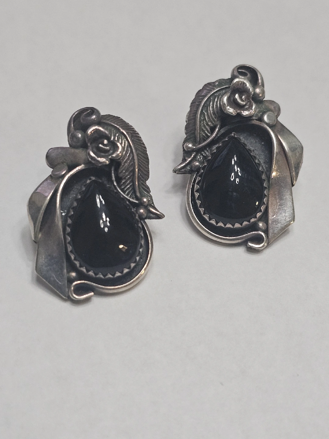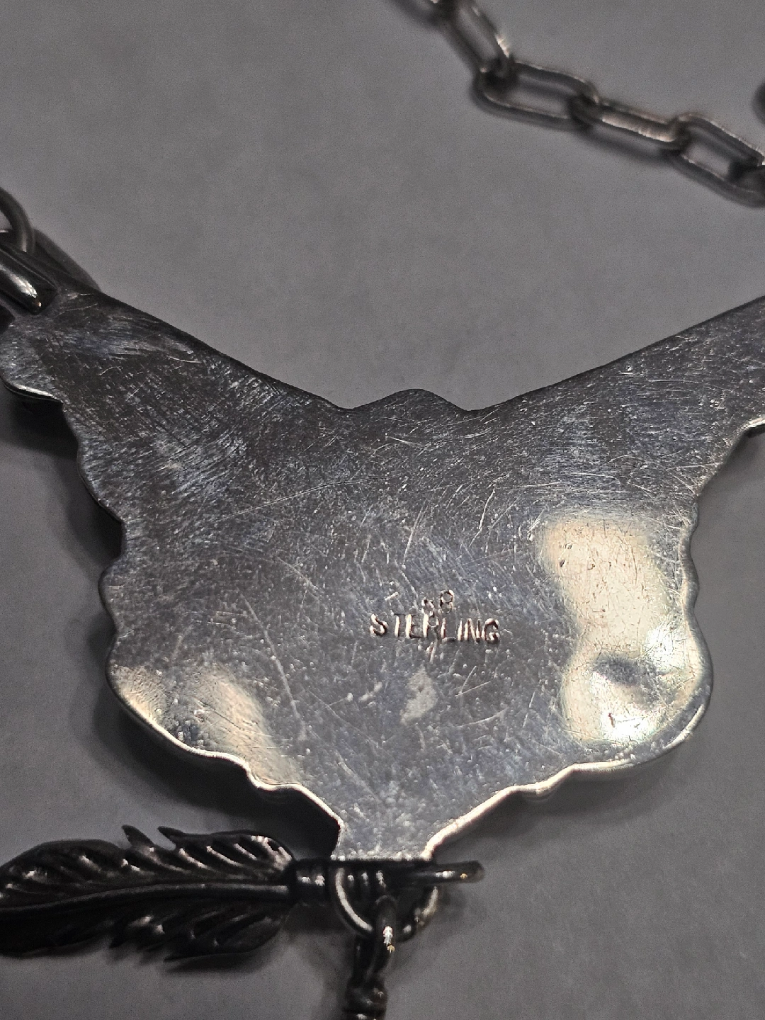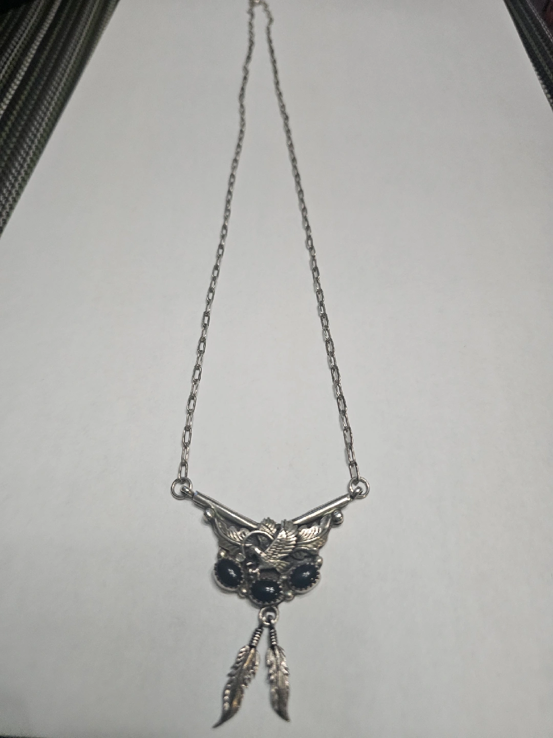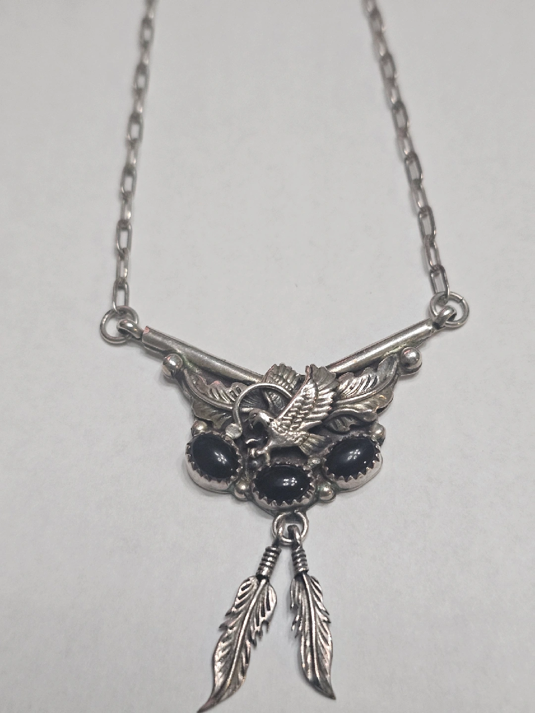 Selling a lovely set of sterling silver jewelry! The set includes a necklace with a unique pendant featuring an eagle design and feather accents, and matching earrings with black onyx stones. Both pieces are stamped 'Sterling' and have a beautiful, vintage look. Perfect for adding a touch of elegance to any outfit!