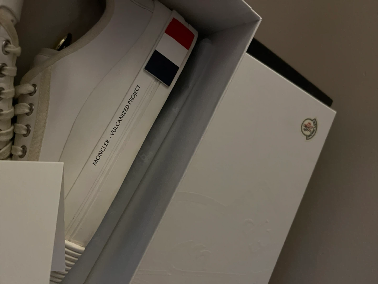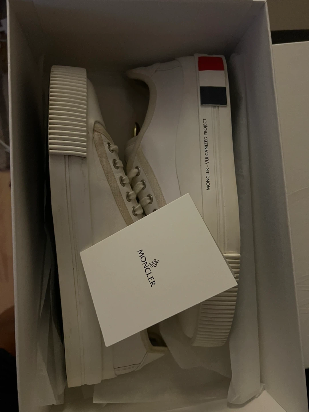 Selling a pair of Moncler Vulcanized Project sneakers in white. They come with the box. Size USA 9.0.
