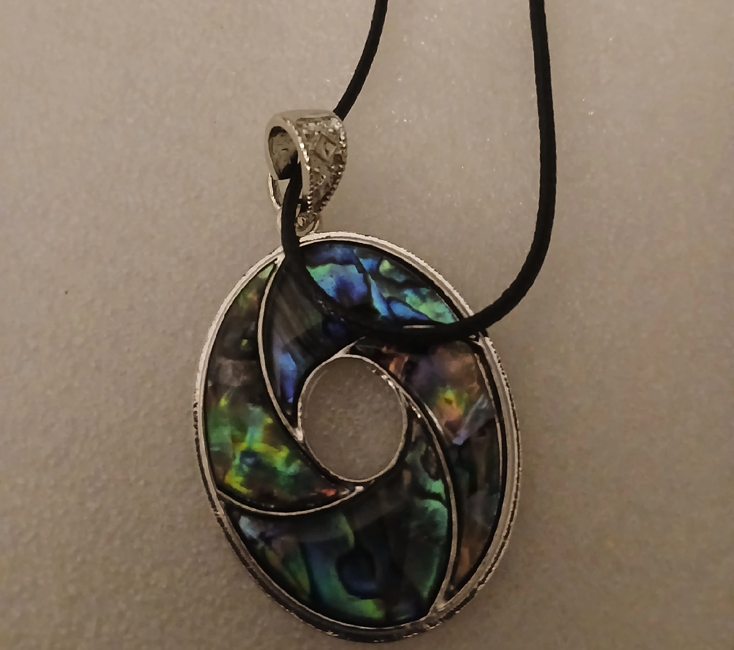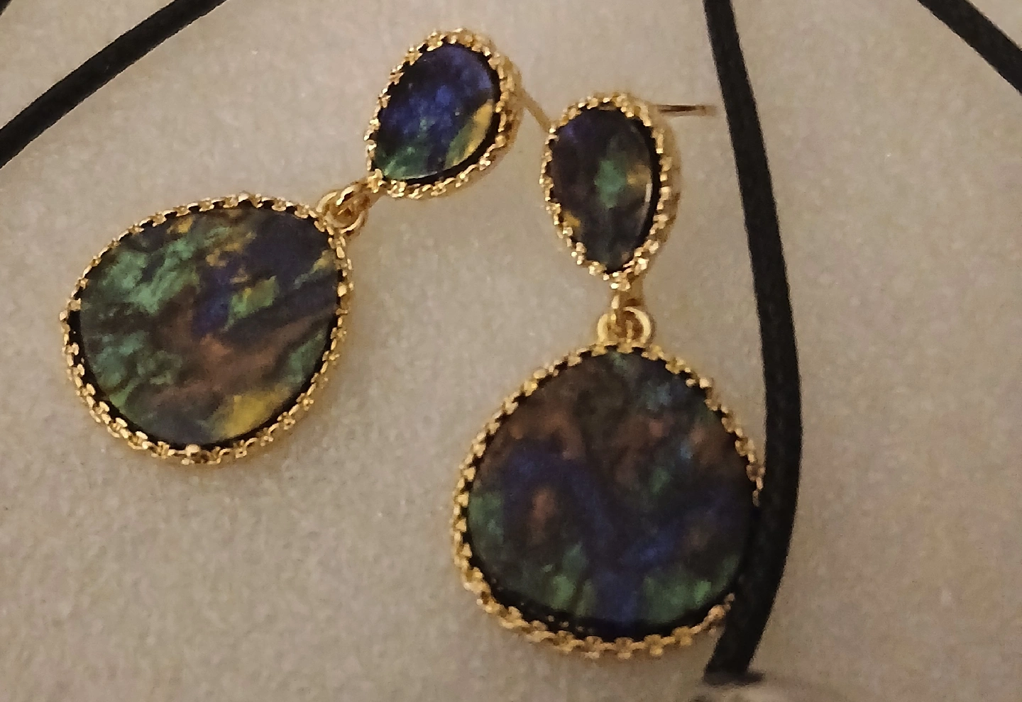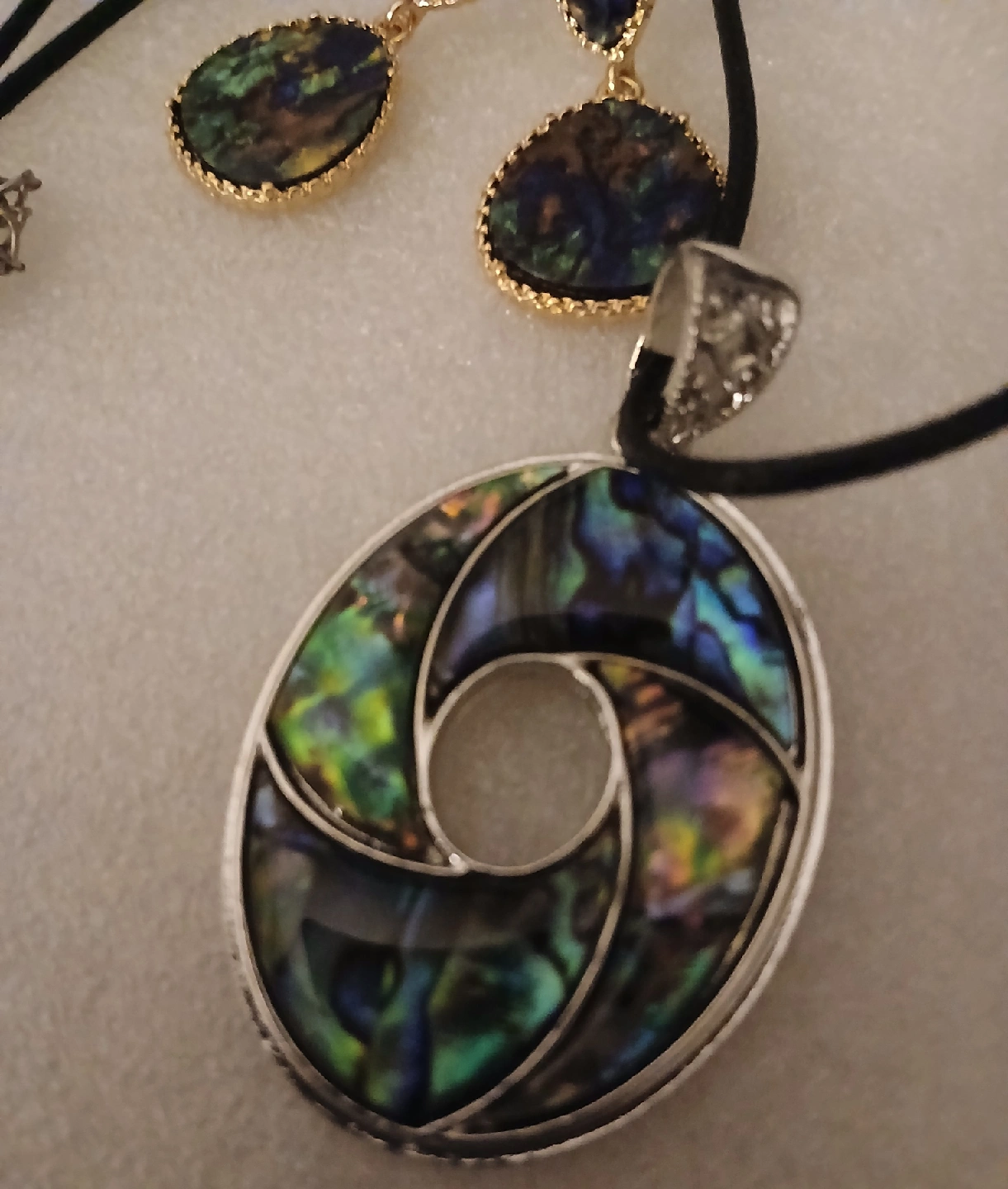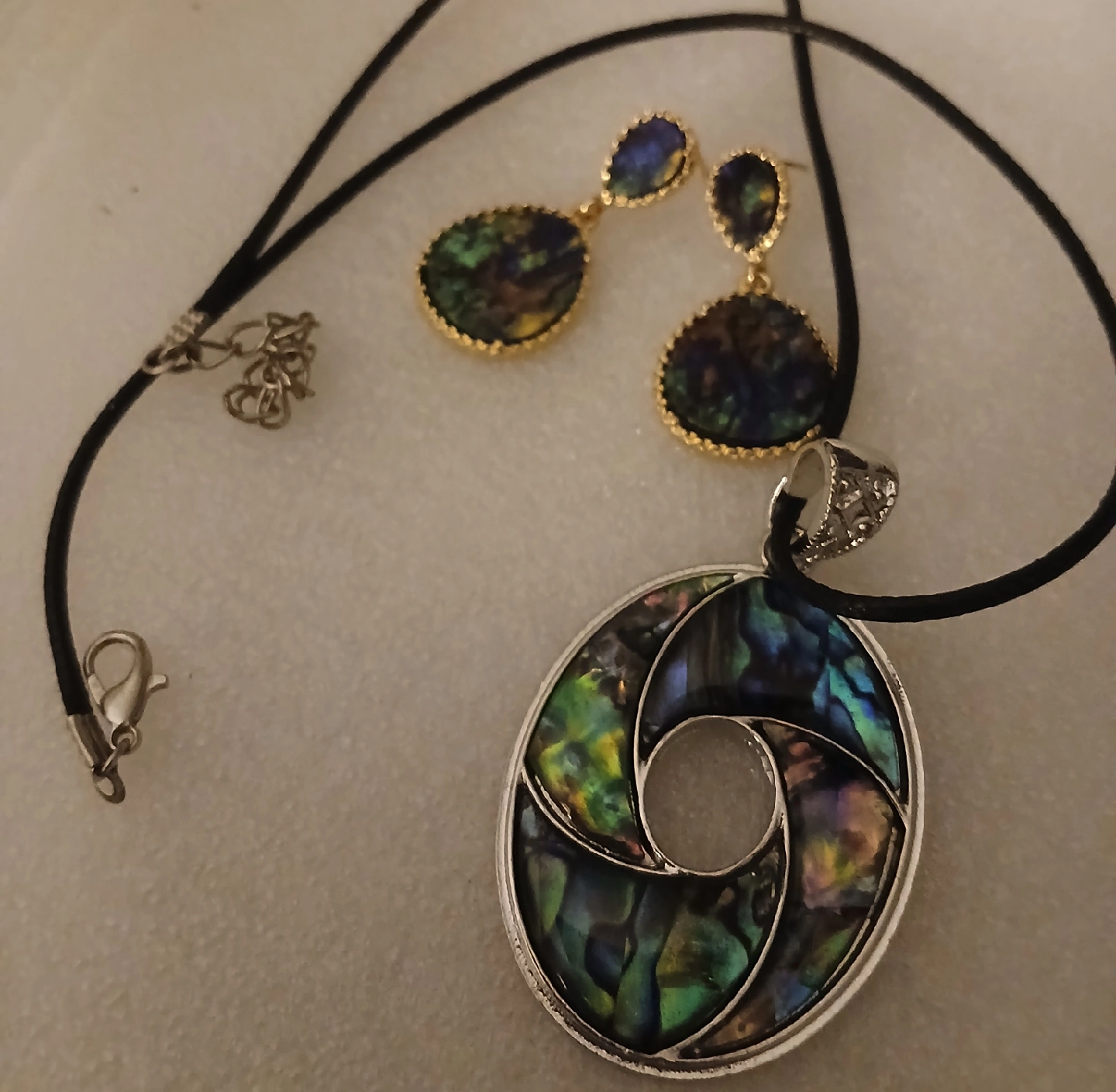 Beautiful necklace and earrings set featuring abalone shell. The necklace has a unique circular pendant, and the earrings complement the set perfectly. pendant is 2 " check out other listings to save and bundle priced