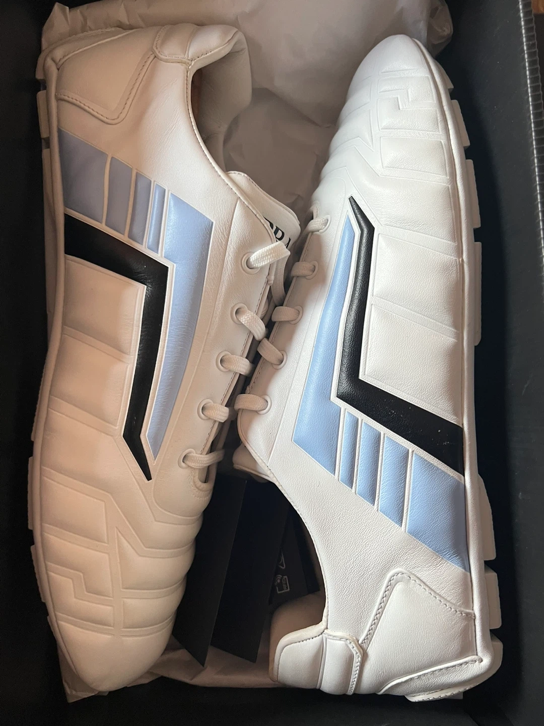Selling a pair of ORIGINAL, Brand New, in box, Prada Calzatore Uomo sneakers in white leather. They feature a unique design with light blue and black accents. Comes with the original box! Bought from Holt Renfrew in Calgary for $1,250 (please refer to the original Holt Renfrew tag on the sole of the left shoe).
