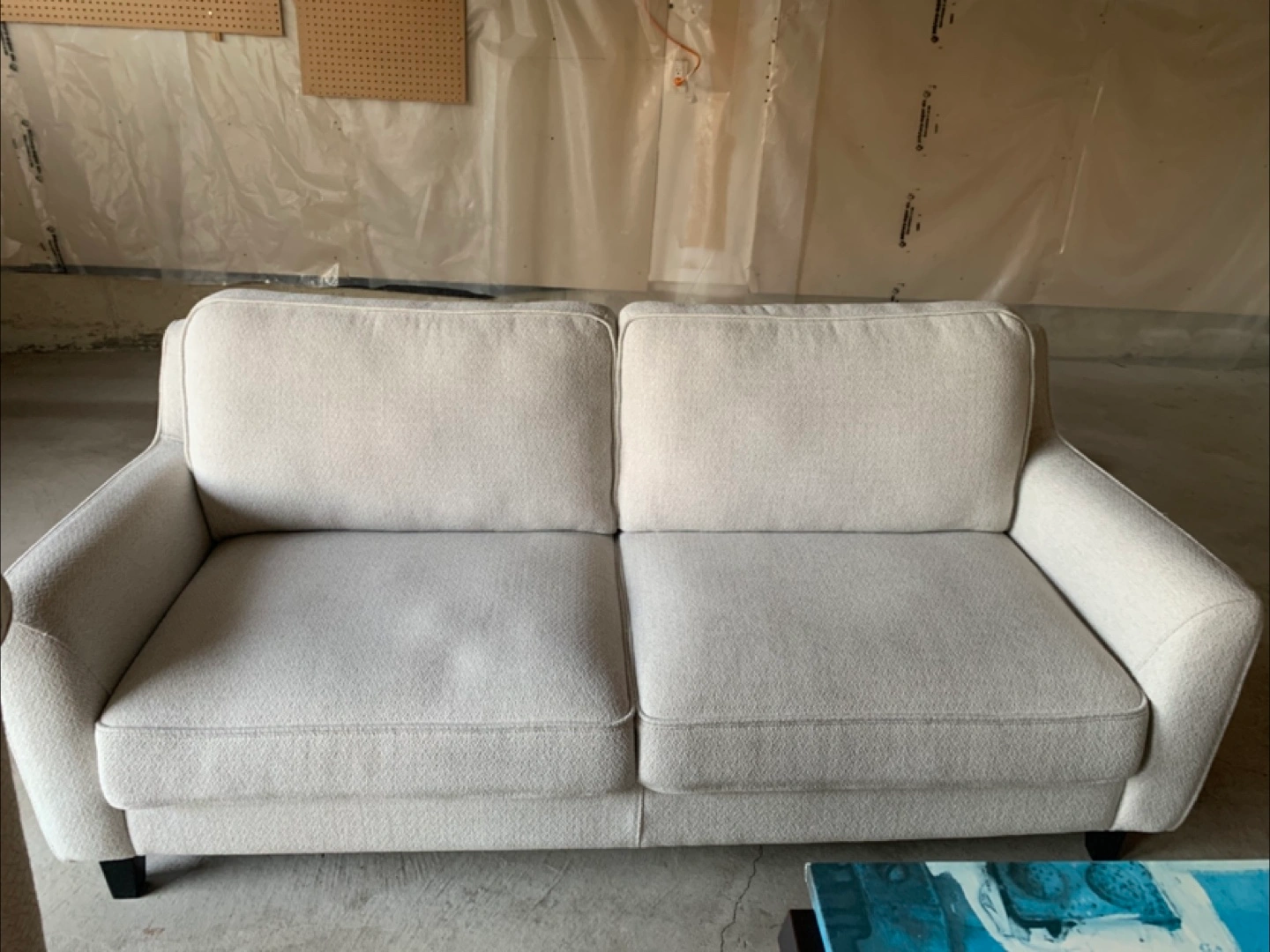 Selling a comfy sofa in a neutral white colour. It's in great shape and would be perfect for a small living room or apartment. The fabric has a nice texture and the cushions are supportive