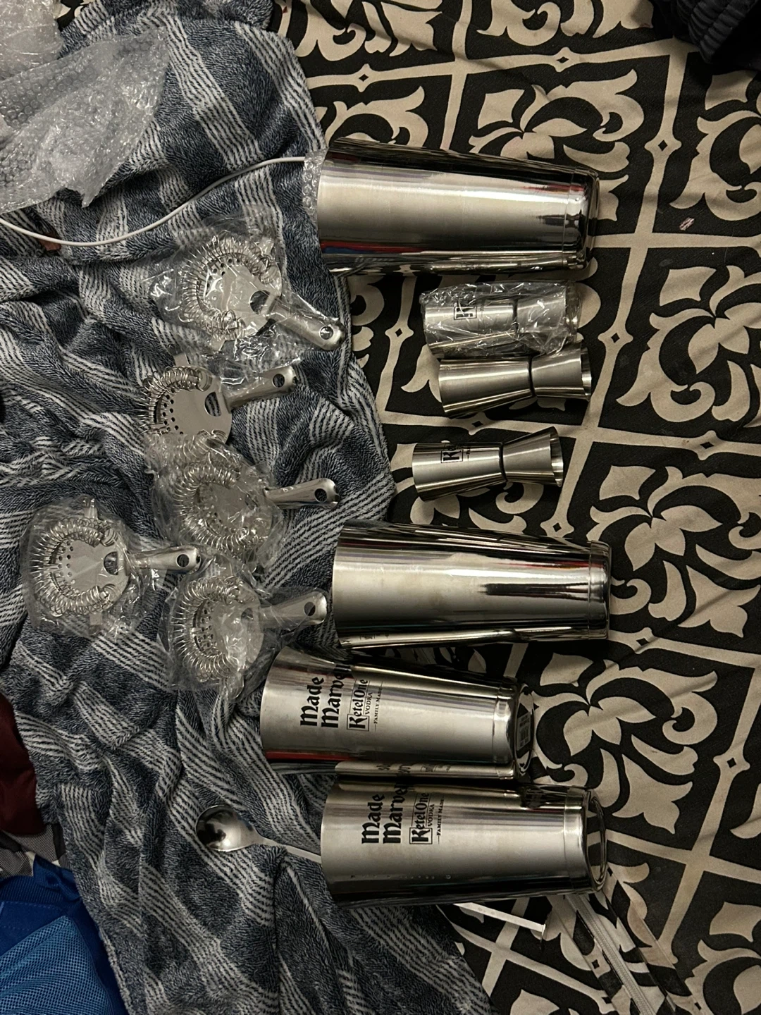 Selling a Ketel One Made Maroon cocktail shaker set. It includes shakers, strainers, jiggers, and a spoon. Everything is still in its original packaging, so it's all brand new and ready to use for your next cocktail night!