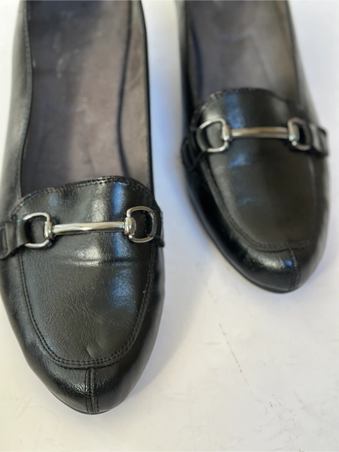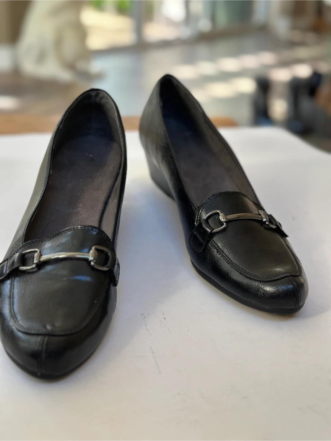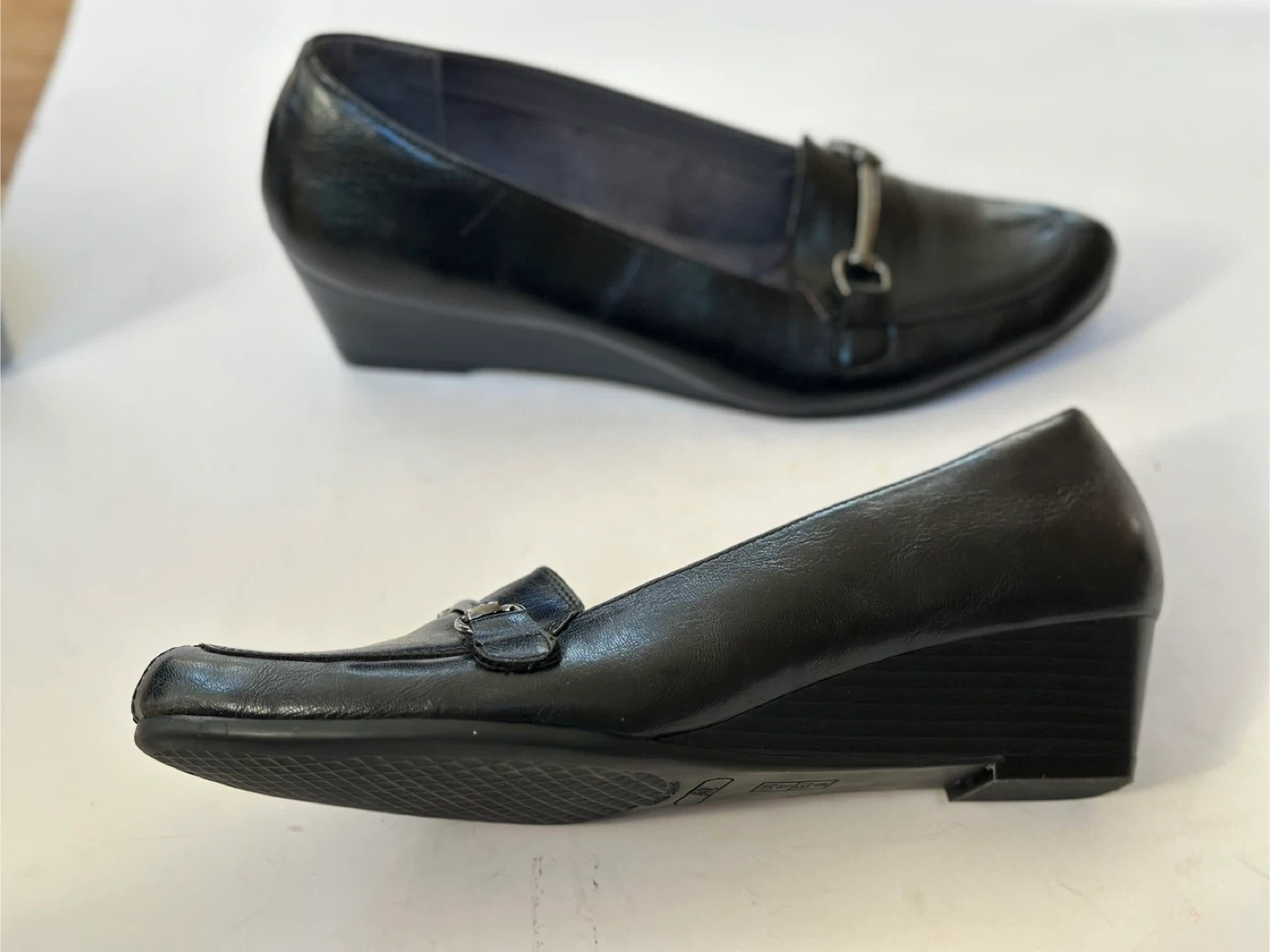 A2 black leather loafers with a comfort wedge heel and a metal buckle detail. Size : UK 9 /US 11 In very good preloved condition With some minor wear on the insole see pic. These shoes have been meticulously cleaned and sanitized. From a smoke free, pet free home. Pick up in Alta Vista.