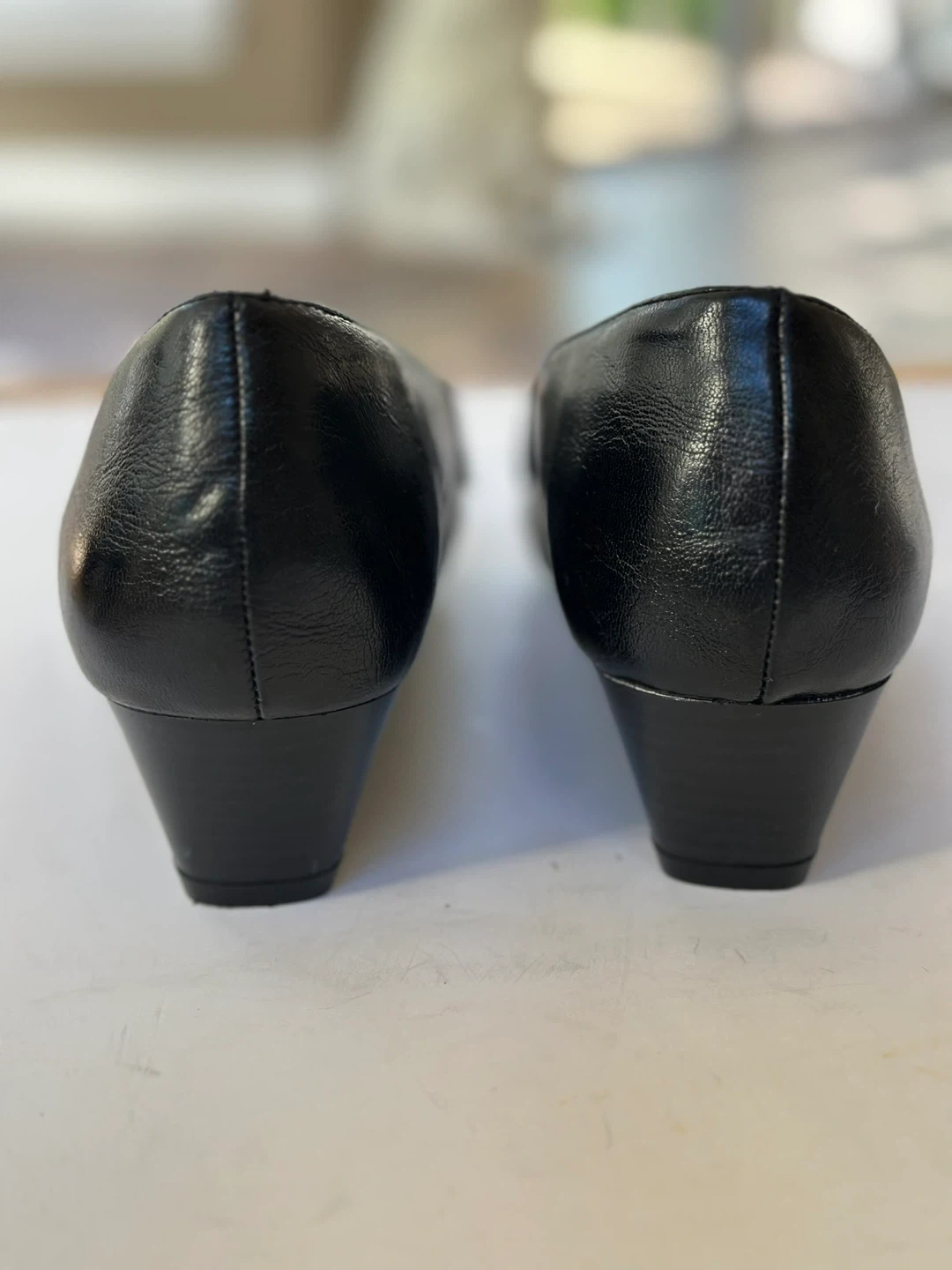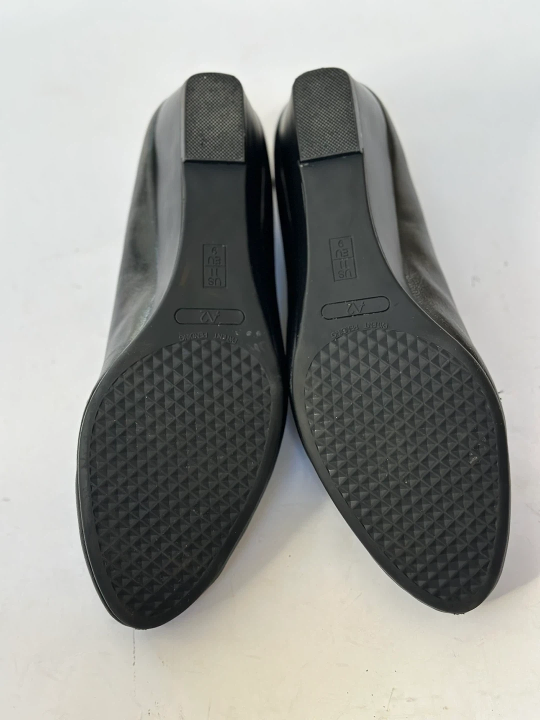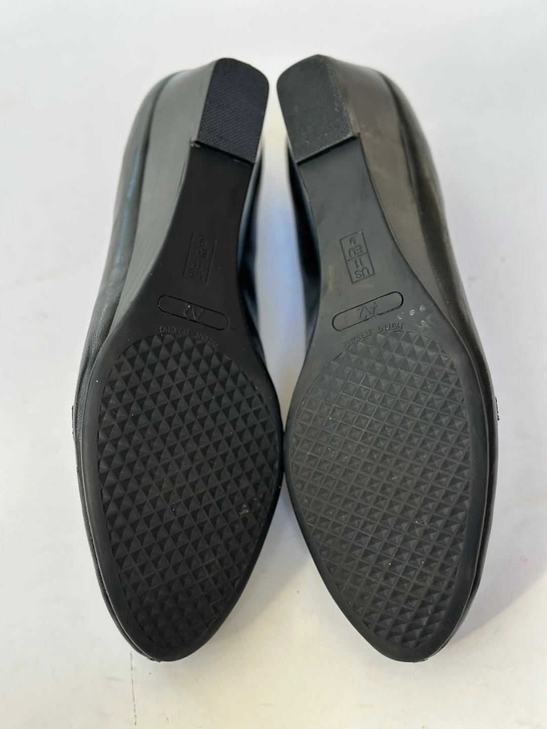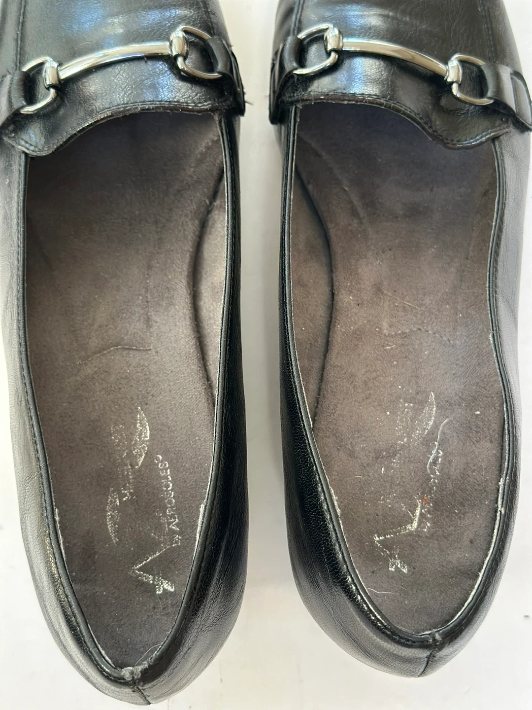 A2 black leather loafers with a comfort wedge heel and a metal buckle detail. Size : UK 9 /US 11 In very good preloved condition With some minor wear on the insole see pic. These shoes have been meticulously cleaned and sanitized. From a smoke free, pet free home. Pick up in Alta Vista.