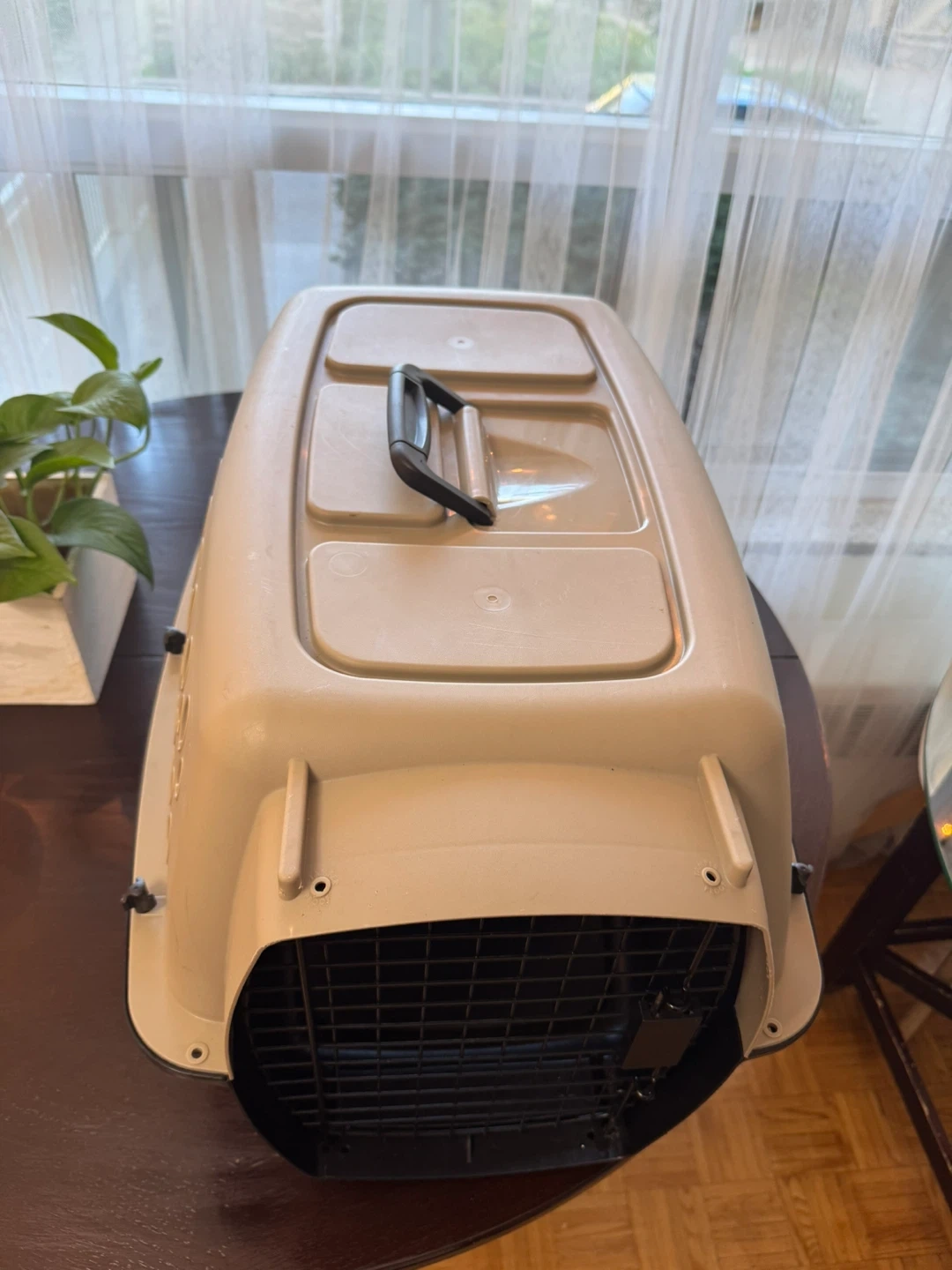 Selling a pet carrier in beige and black. It's in great shape and ready for your furry friend's adventures! Perfect for vet visits or travel