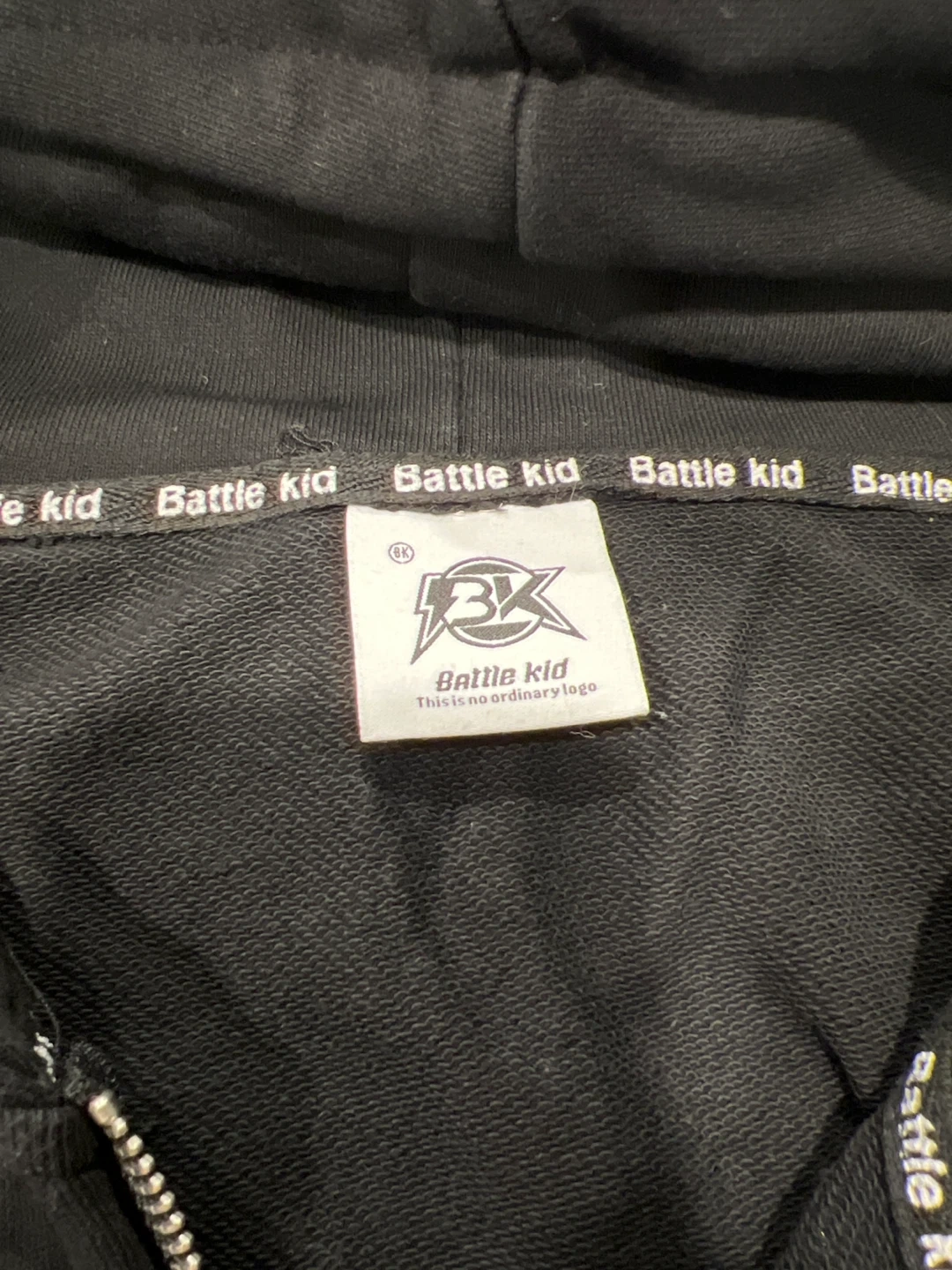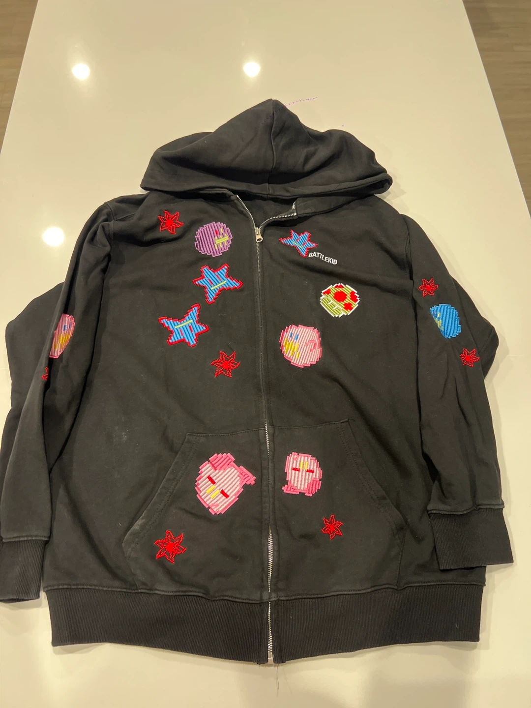 Selling a black zip-up hoodie from Battle Kid. It features a unique design with pixelated heart and character embroidery. It's in good condition and ready for a new home!