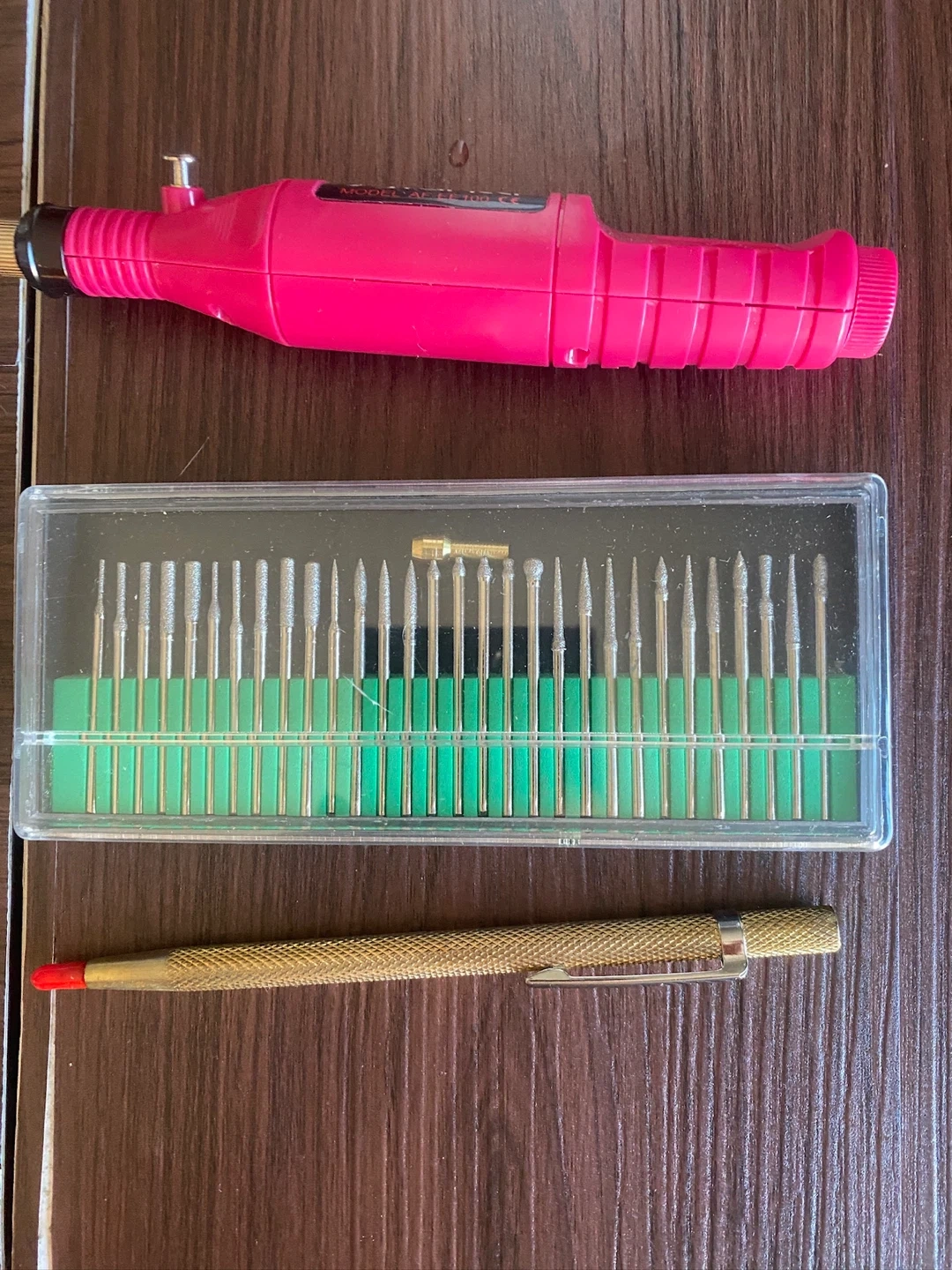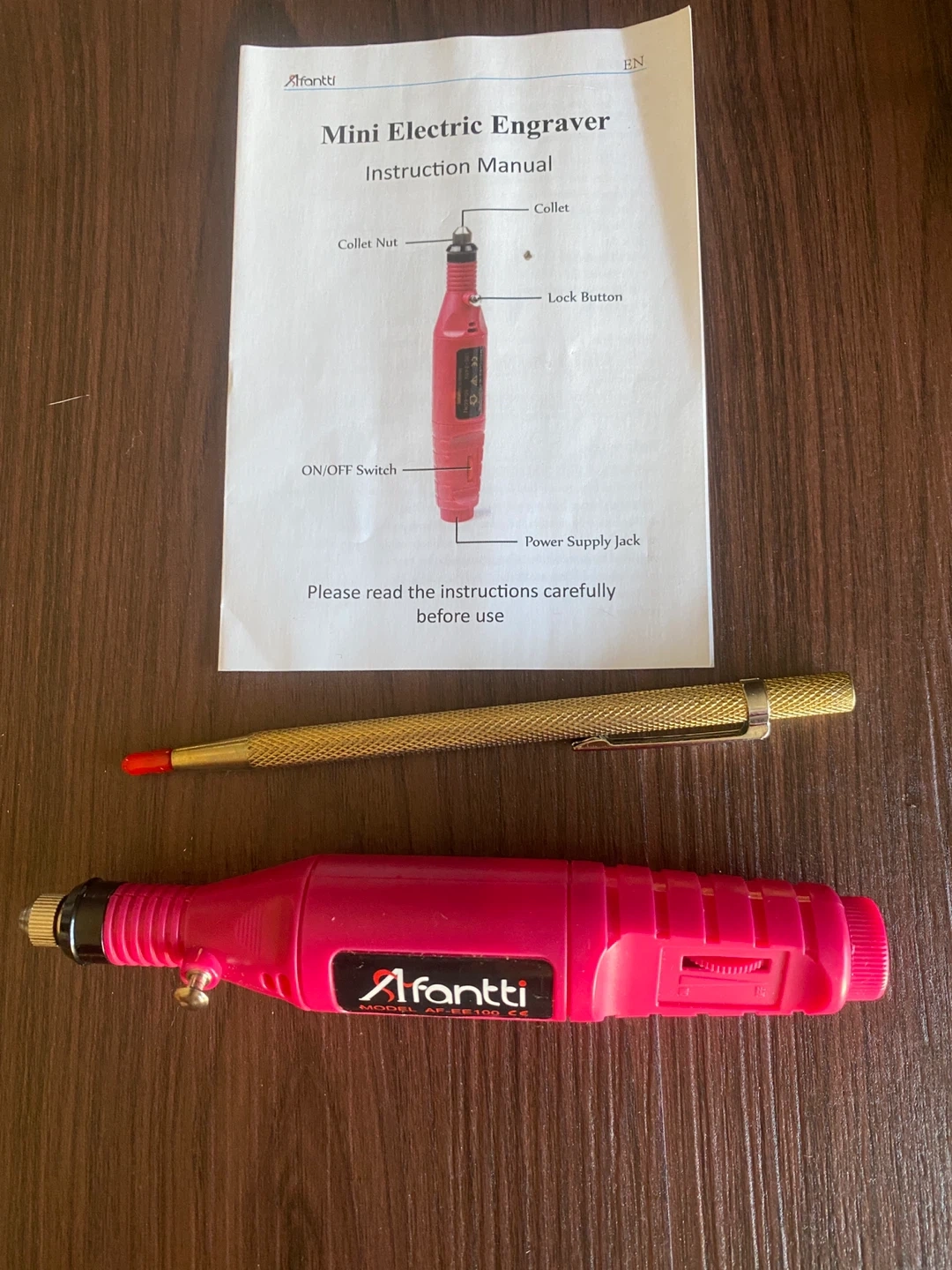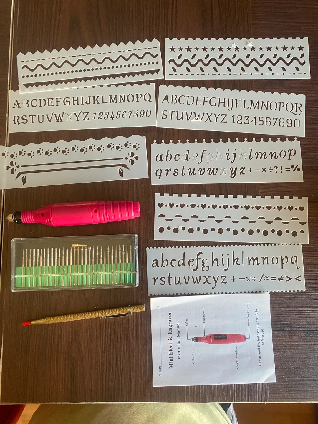 This is an Alfantti Mini Electric Engraver kit. I comes with the engraver, various drill bits, stencils, and an instruction manual. The engraver is pink and the stencils are white. Great for small projects!