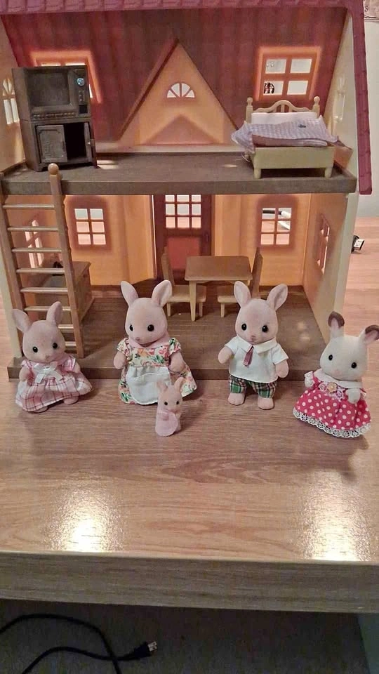 Adorable Sylvanian Families (also known as Calico Critters) set including: 1 two-story house with furniture (bed, dining table, 2 chairs, and kitchen unit) 5 rabbit family figures (parents, children, and baby) Original mini booklets and accessories Everything is in great pre-loved condition, clean and ready for play or display. Perfect for collectors or children who love imaginative play!