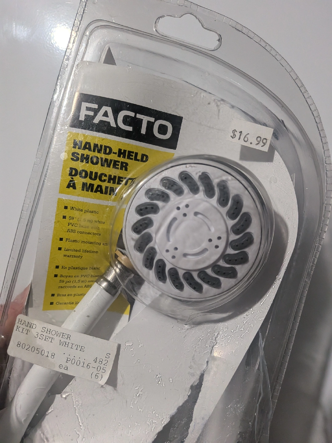 I'm selling a brand new Facto hand-held shower kit! It comes with 3 spray settings: Full Spray, Massage Spray, and Full Spray/Thin Jet. The shower head is white plastic with ABS connectors. It includes a 59" (1.5 m) white PVC hose. Originally priced at $16.99. Shower head measures approximately 2 3/4 inches in diameter Doesn't fit plumbing, so can't use. Only too out of box to look at attachments ** Cash only, no etransfers ** No holds, first come first serve Location: Etobicoke. Rathburn Rd and Renforth dr. Etobicoke Olympium nearby