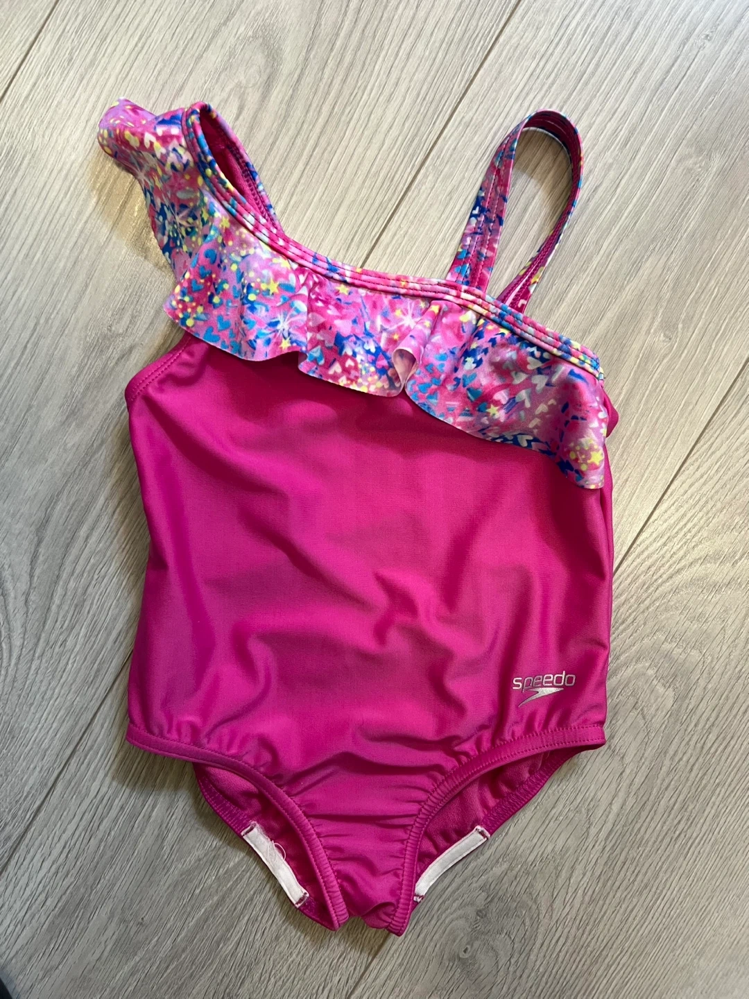 A cute pink Speedo swimsuit in size 6! It features a fun floral pattern on the straps and ruffle. Perfect for your little one's swimming adventures Like new used 2 times