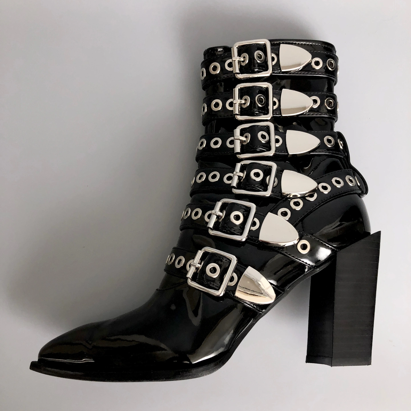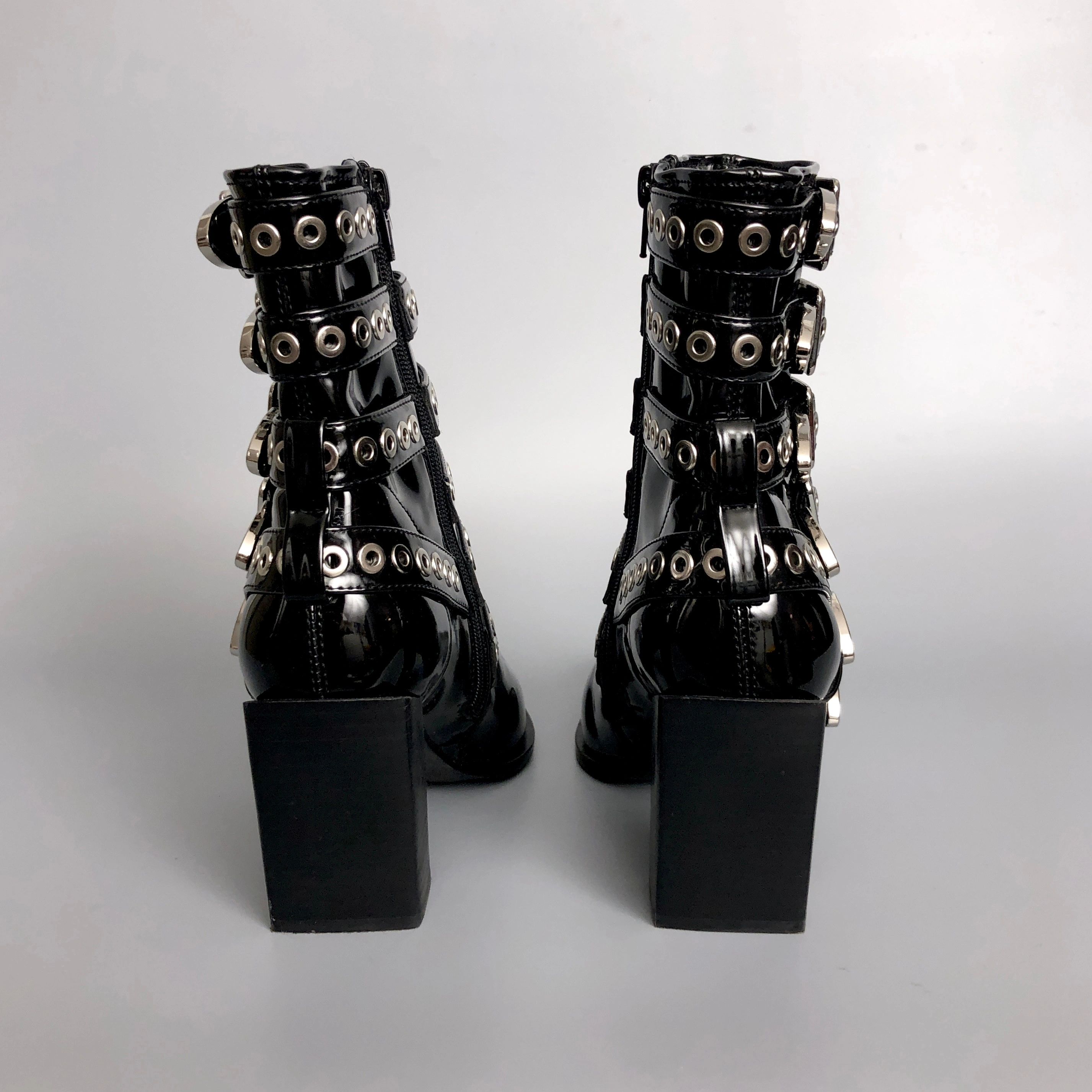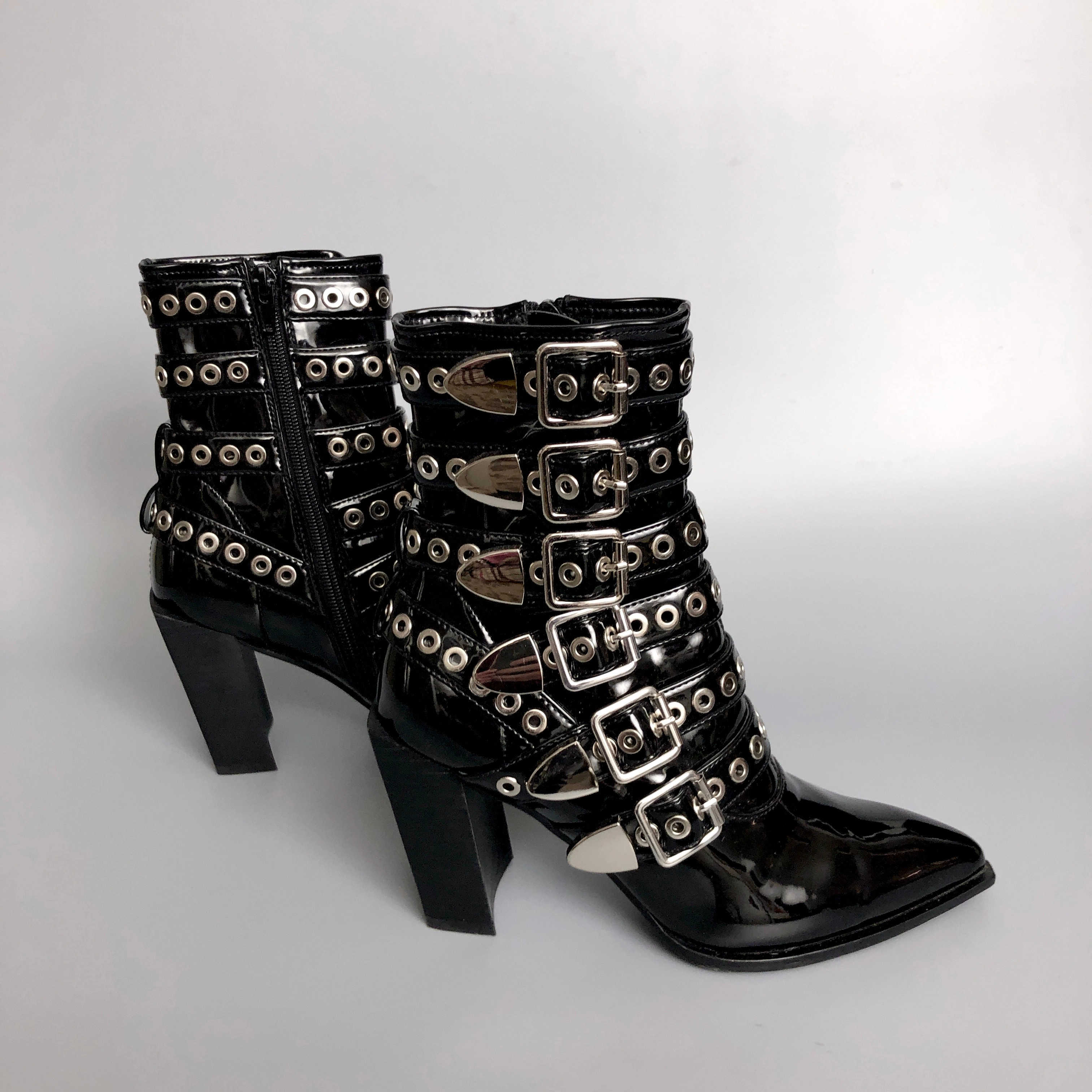 Like new (seriously very little wear) buckled ankle boots by B2. Nice kick A $ $ boots! MSRP of $295. Check our other listing for unique, high quality items and good value. Follow us! Tags: boots, ankle boots, heels, B2, women's, clothing, fashion, boss, bomb, butch, goth, punk, black, chrome, PVC, faux, patent, leather,